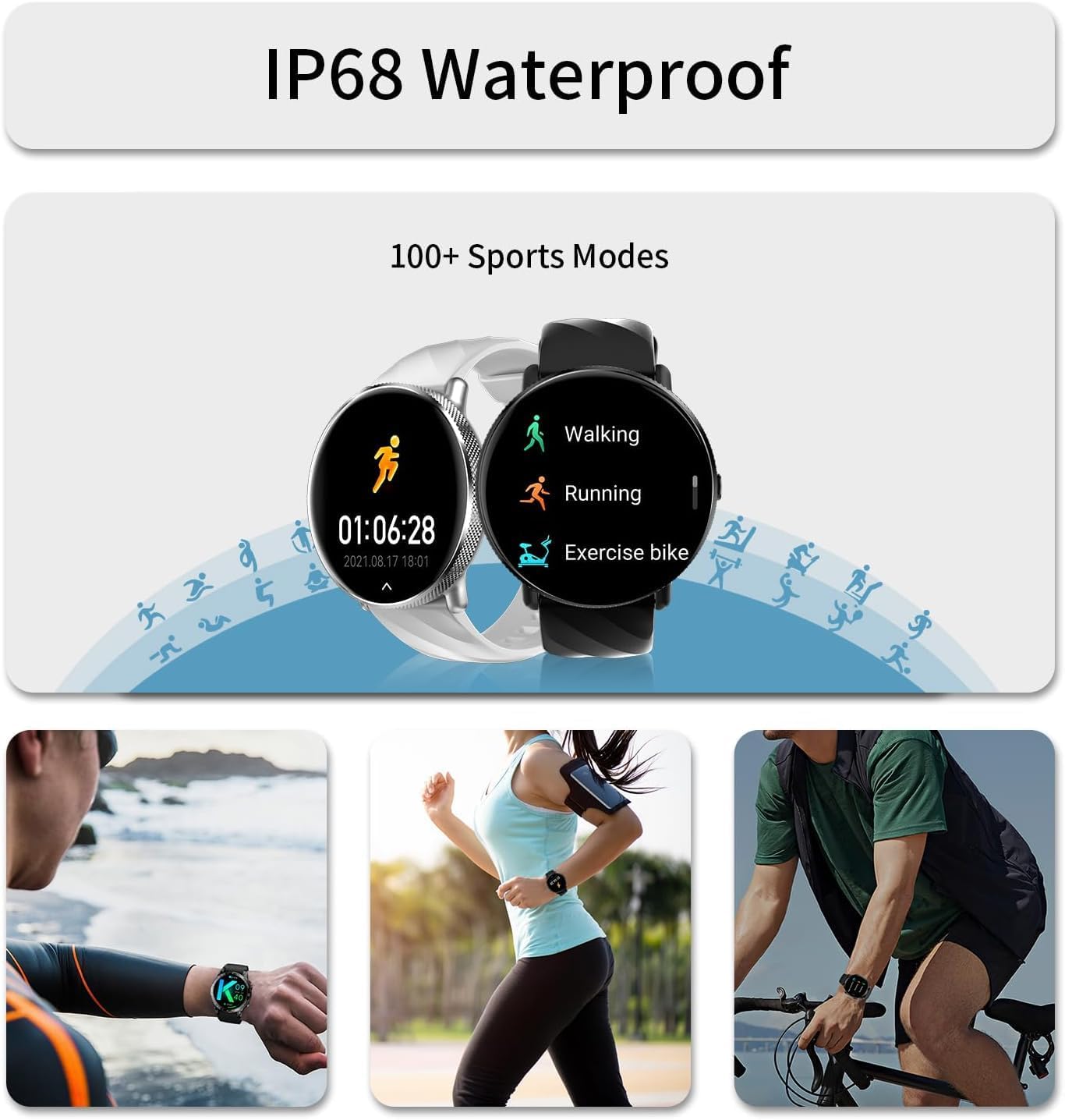 100+ Sports Modes & IP68 Waterproof: Our fitness watch is equipped with different sports modes such as walking,running,cycling,yoga and other indoor and outdoor activities.Tracking automatically your steps,distance,calorie burn,and activity time.The sport watch features IP68 waterproof rating,making that it can withstand sweat,hand washing,or rain in daily life