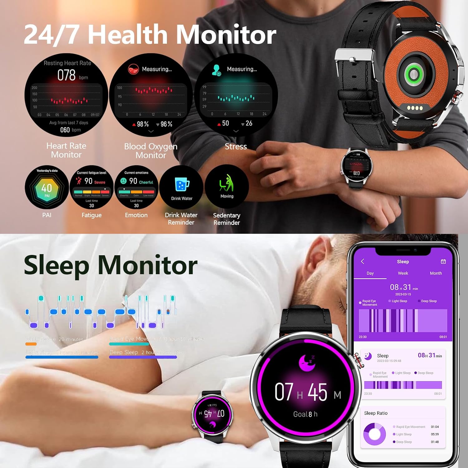 Large Battery & High Compatibility & More Features: This smart watch for android phones and ios phone features a large 550ml battery for extended battery life. It’s compatible with iOS 9.0 and above and Android 5.0 and above. It offers a wealth of features, including an AI voice assistant, weather display, music control, camera control, calculator, phone finder, alarm, timer, stopwatch, and more. (Package Includes: Smartwatch (with leather strap), spare silicone strap, charging cable, and user manual)