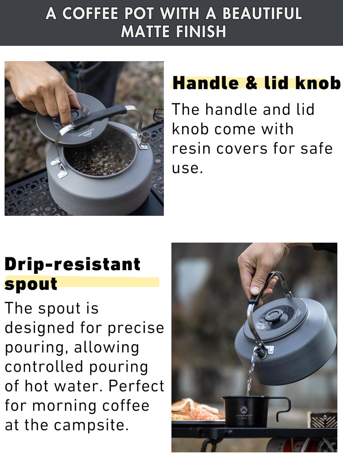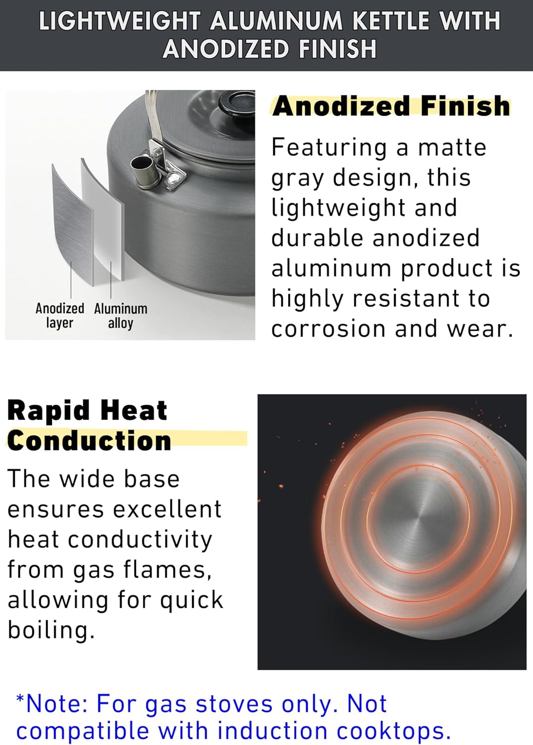 This 1.5 Liter hard-anodized aluminum camping tea kettle is only 7.8oz weight, which is lightweight and compact for camping, backpacking.