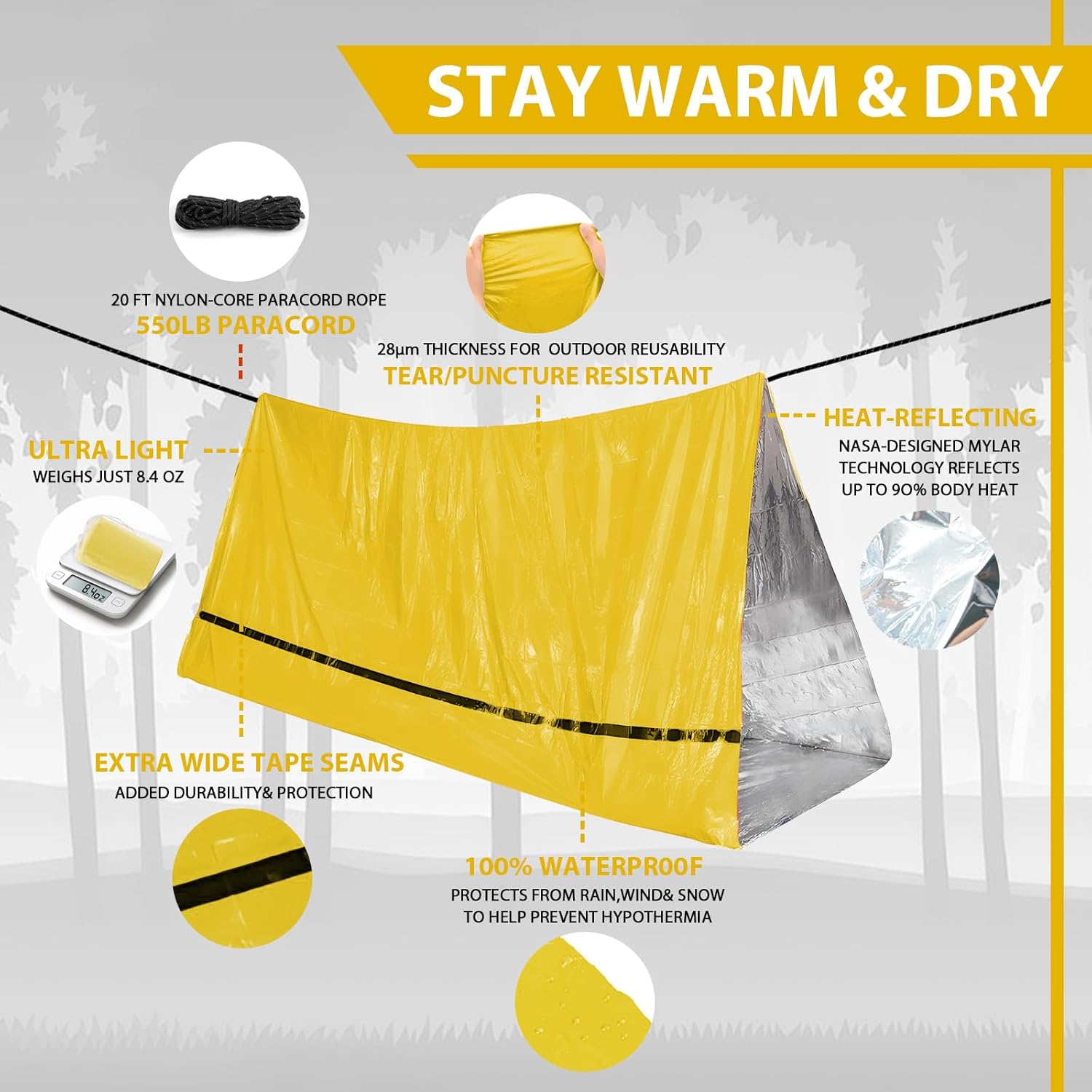 Exceptional Weather Resistance, Lightweight Design: Weighing just 8.7 ounces, our emergency storm shelter is a lightweight wonder. It packs neatly into a tiny 5 x 3 – inch storage bag, ensuring portability. This reusable gem shields you from harsh weather, be it a winter gale or a heavy downpour, without adding extra weight.