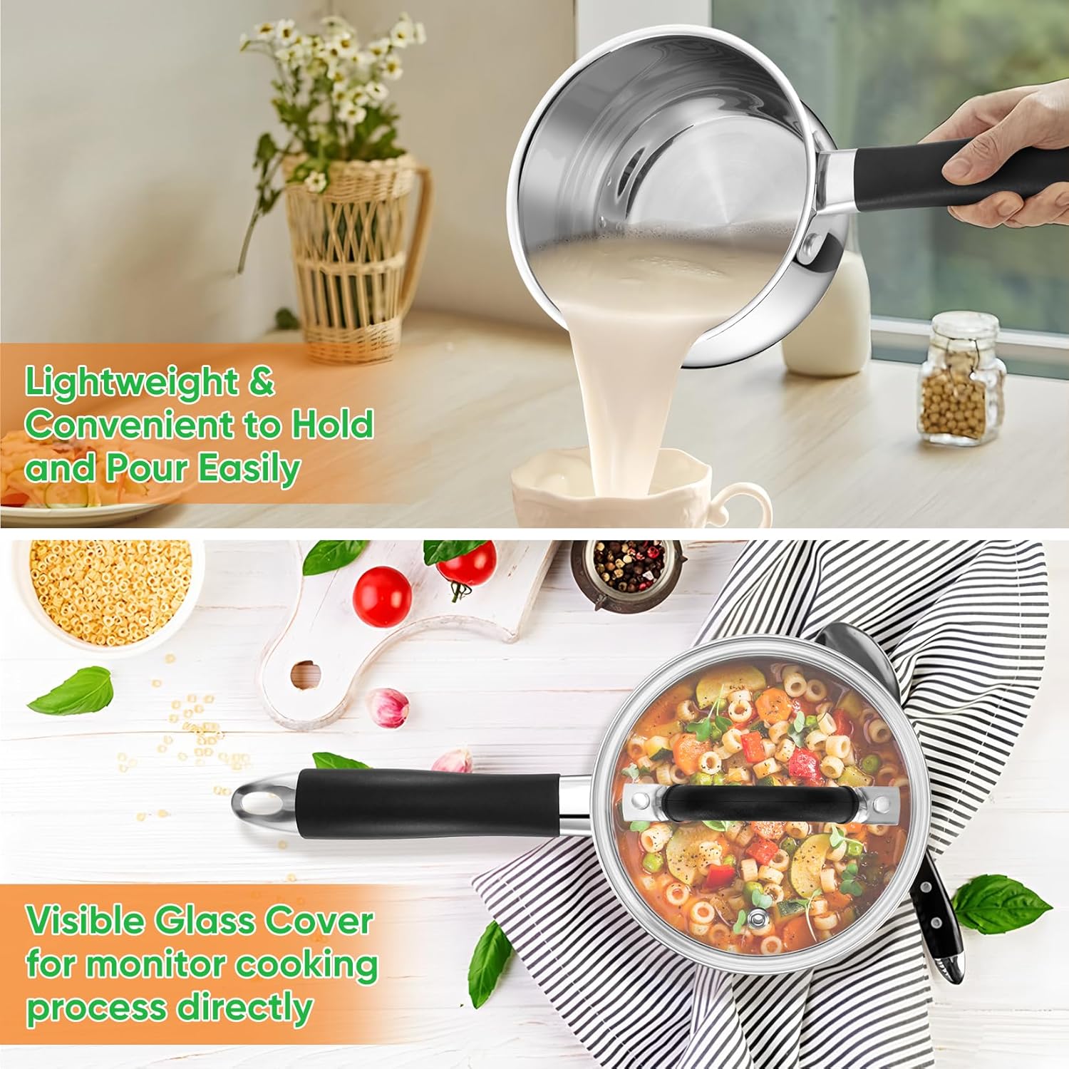 【Premium & Lightweight】The 1qt saucepan body is made of premium stainless steel with no any coatings, No worries about coatings falling out or peeling into your food during use, Non-toxic material ensures the food-grade and healthy cooking, The stainless steel sauce pan is designed 1-layer stainless steel and 3-layer bottom, which could no only ensure its high performance and but also offer a light weight for your comfortable to use, Sturdy construction for lasting use