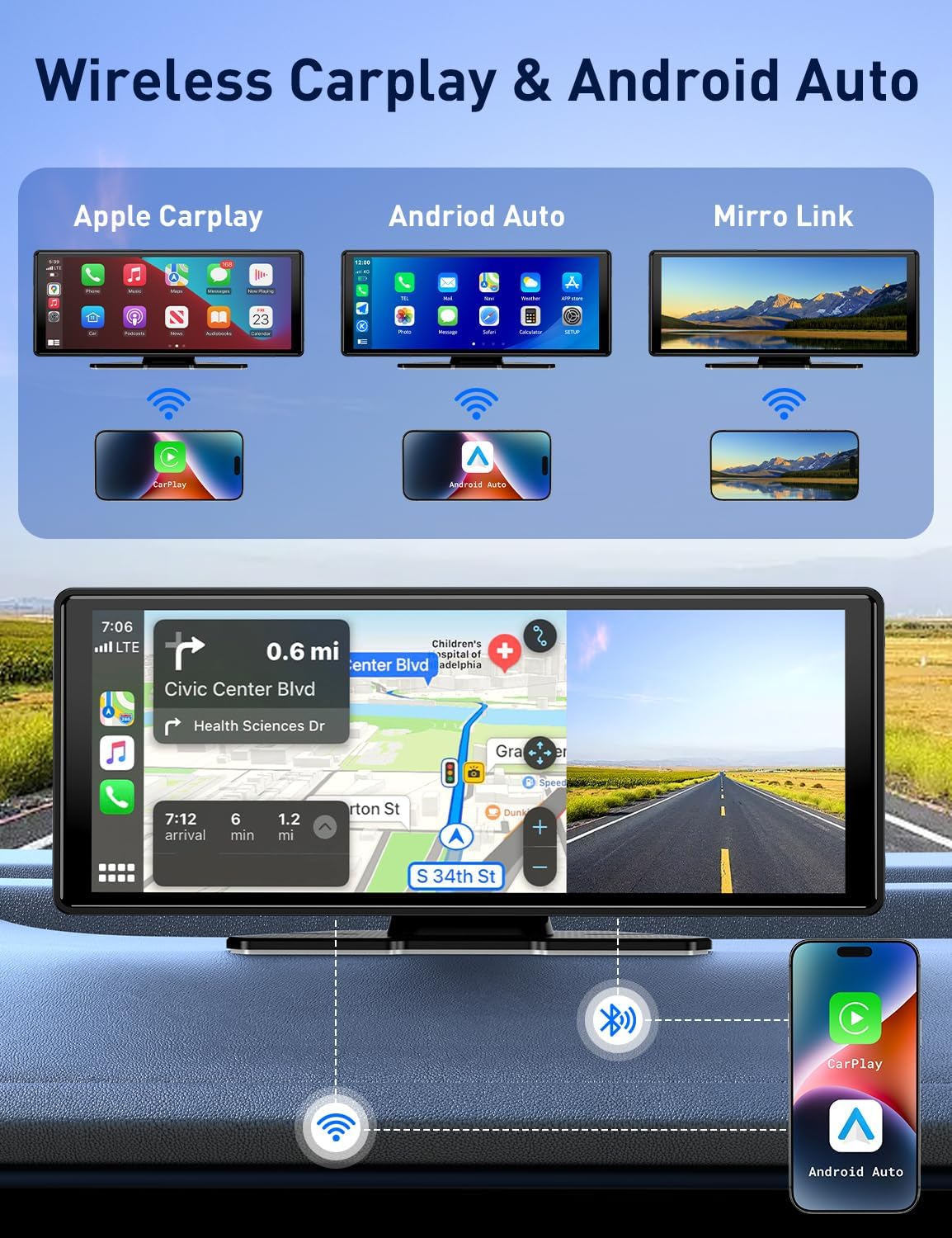 ✅【Wireless Carplay / Android Auto】This portable car stereo supports both Wireless Apple CarPlay and Android Auto, enabling seamless access to music, navigation, messages, and calls via Bluetooth, Wi-Fi, or USB. It also supports voice control through Siri or Google Assistant for a safer driving experience. It will try to automatically connect to the last connected phone