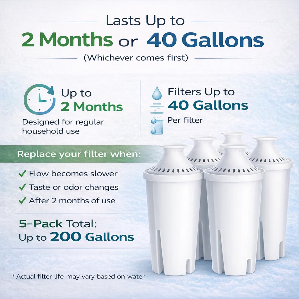 THE FILTERS: Included inside the pitcher are five (5) Joey’z filters. Boasting both NSF/ANSI 42 and 53 certifications, the Joey’z water purifier set is able to filter out Chlorine taste and odor, PFAS/PFOS, Chloramine, particulates, Iron/Rust, Manganese, Zinc and heavy metals like Cadmium, Mercury, Copper and some amounts of Lead. The Joey’z water pitcher filter also meets NSF372 certification requirements for being free of lead. Each filter purifies 40 gallons and lasts approximately 2 months.