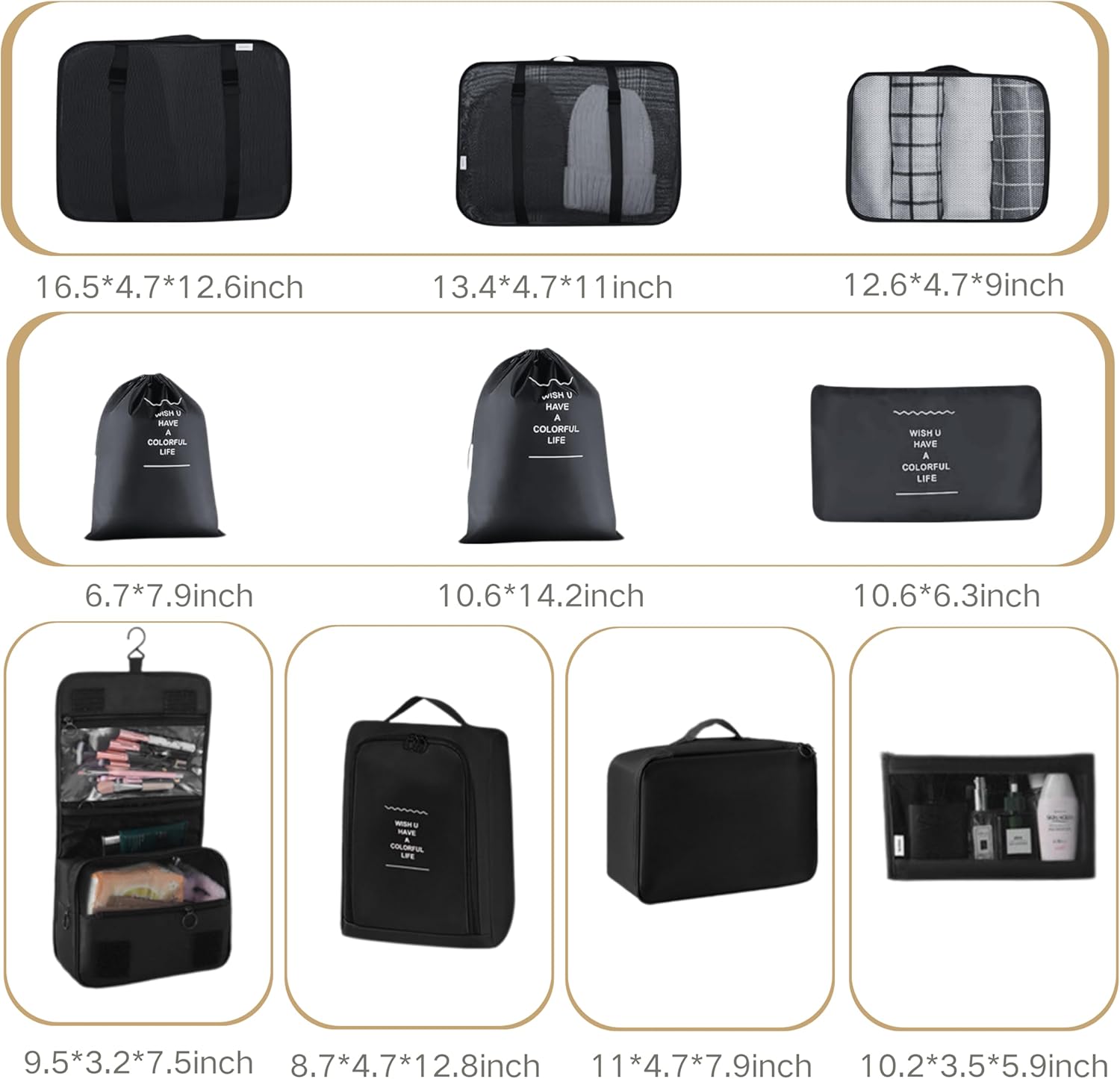 User 1: I love the variety of sizes in this set! It includes everything from small cubes for socks to larger ones for shirts and pants. The wrinkle-resistant design really keeps my clothes looking fresh, even after a long trip!