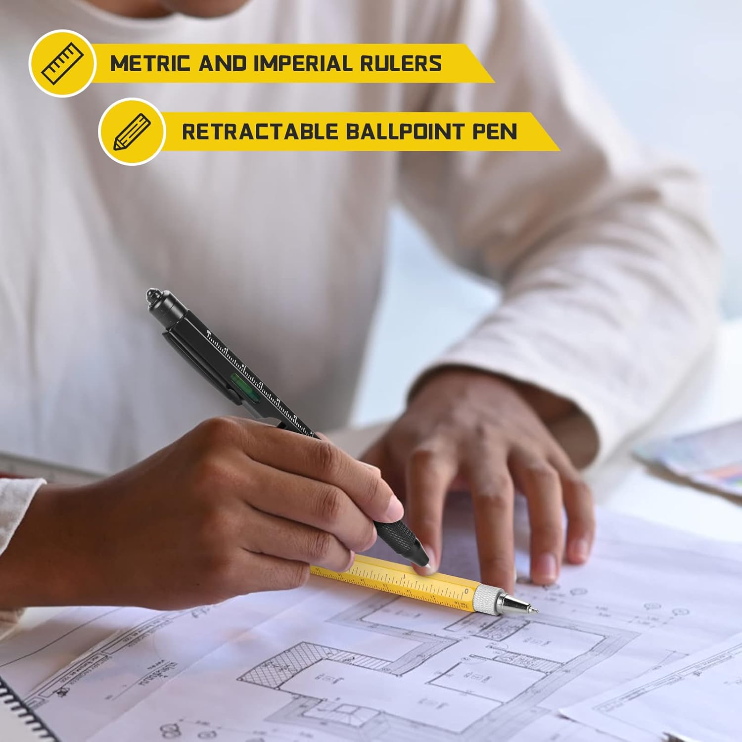 10-in-1 Multifunctional Pen (2-Pack): Combines 10 tools: LED light, stylus, rulers, bubble level, bottle opener, screwdrivers, hex driver, SIM card tool, and ballpoint pen. Different colors for easy identification, perfect for any toolset