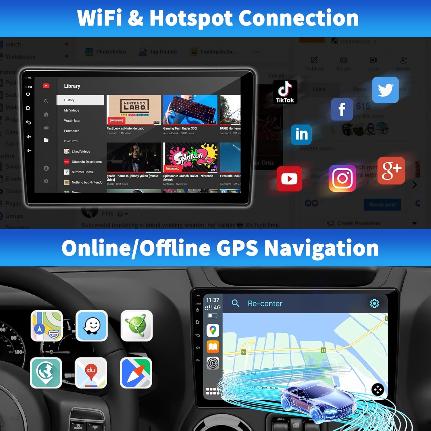 GPS Navigation & Wi-Fi Connectivity: Navigate effortlessly with the built-in GPS module and external GPS antenna, providing online or offline map guidance. Preloaded with offline map data, the system offers voice and visual turn-by-turn directions, an extensive POI library, and 2D & 3D routes. Additionally, benefit from Wi-Fi hotspot connectivity for easy access to online navigation apps and social media via the Play Store