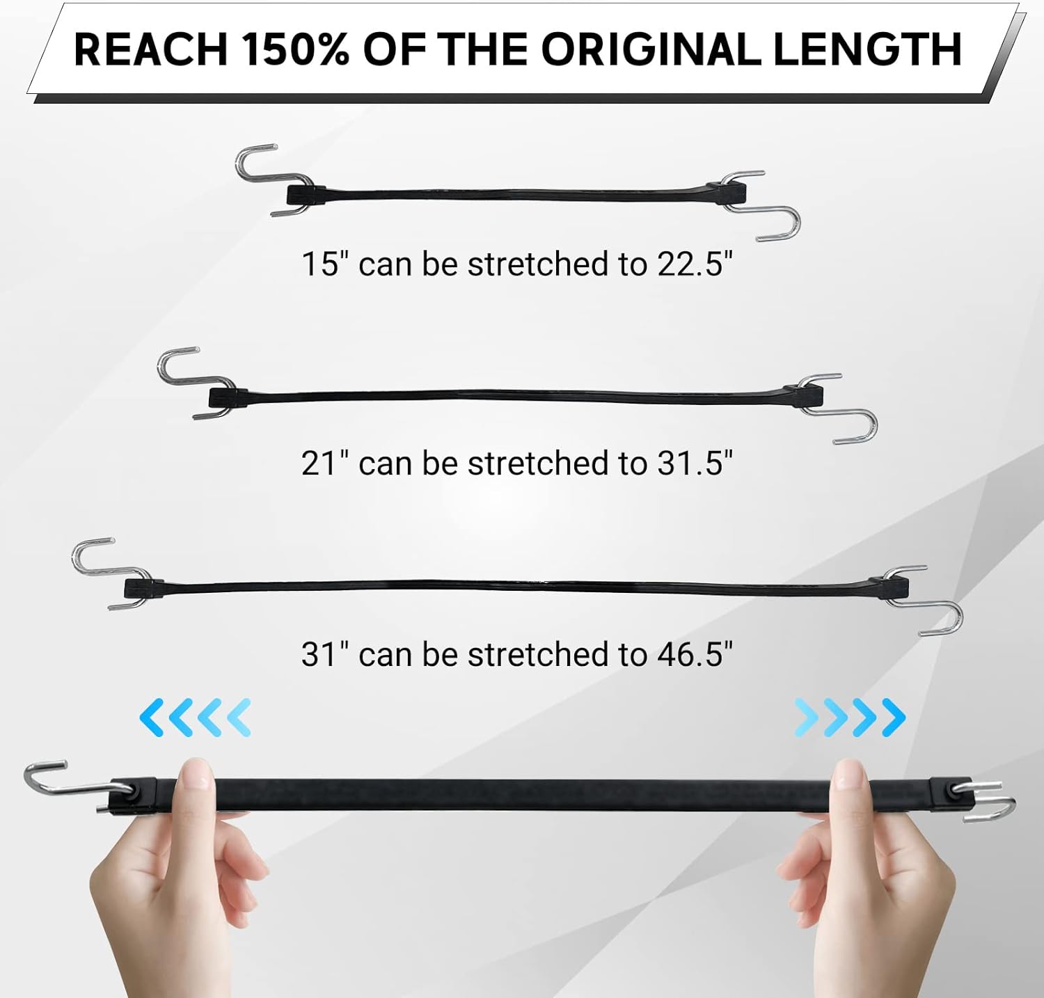 Preferred EPDM Material: Bungee cords with S hooks are made from 100% premium EPDM rubber. Our heavy-duty bungee cords are 30% thicker than other similar products, offering better elasticity, durability and safety. It will not fray or break in everyday use and in all weather conditions and is oxidation resistant, UV protected and has an extra long life. Can be used both outdoors and indoors