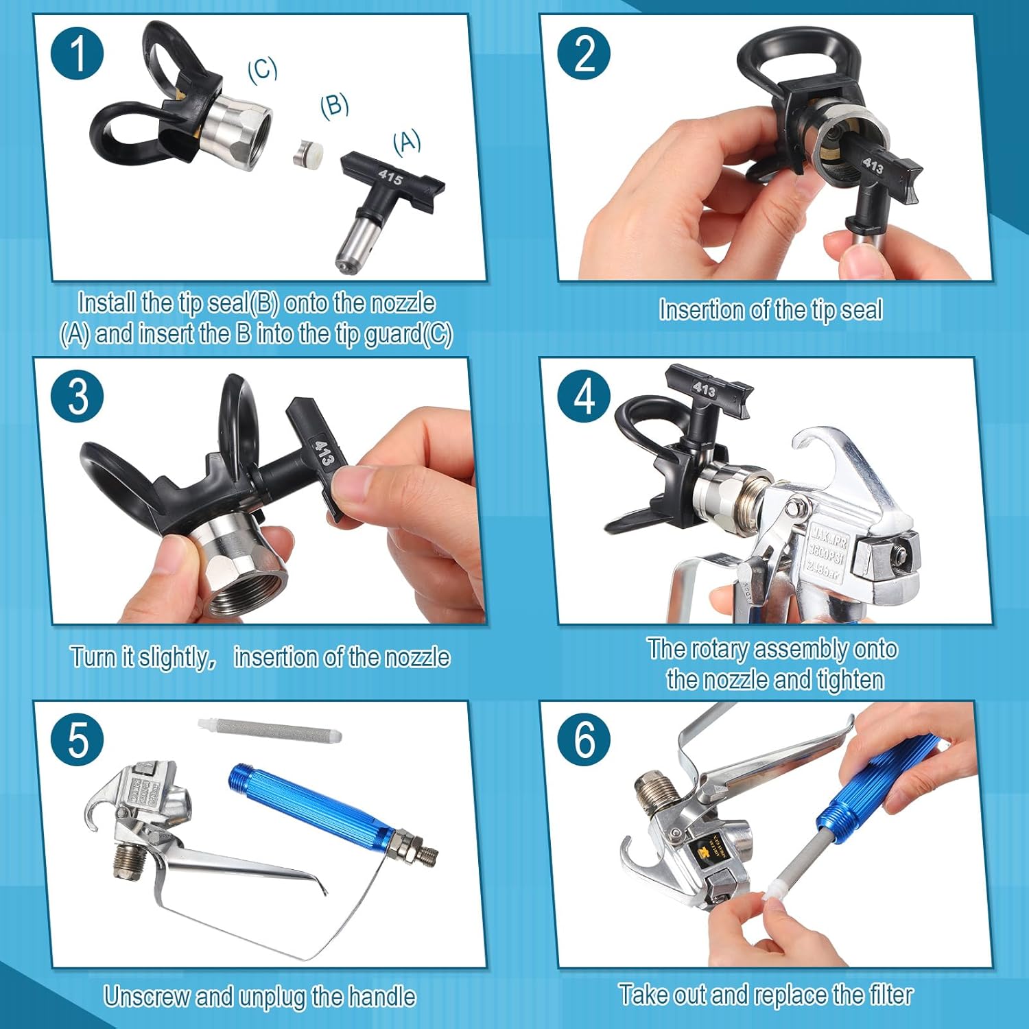 Simple Installation: the spray paint nozzle does not need tools to install; First, insert the nozzle into the protective seat, then insert the nozzle into the protective seat and rotate it to complete the installation; The installation of the filter tube only needs to take out and replace the old filter of the airless sprayer
