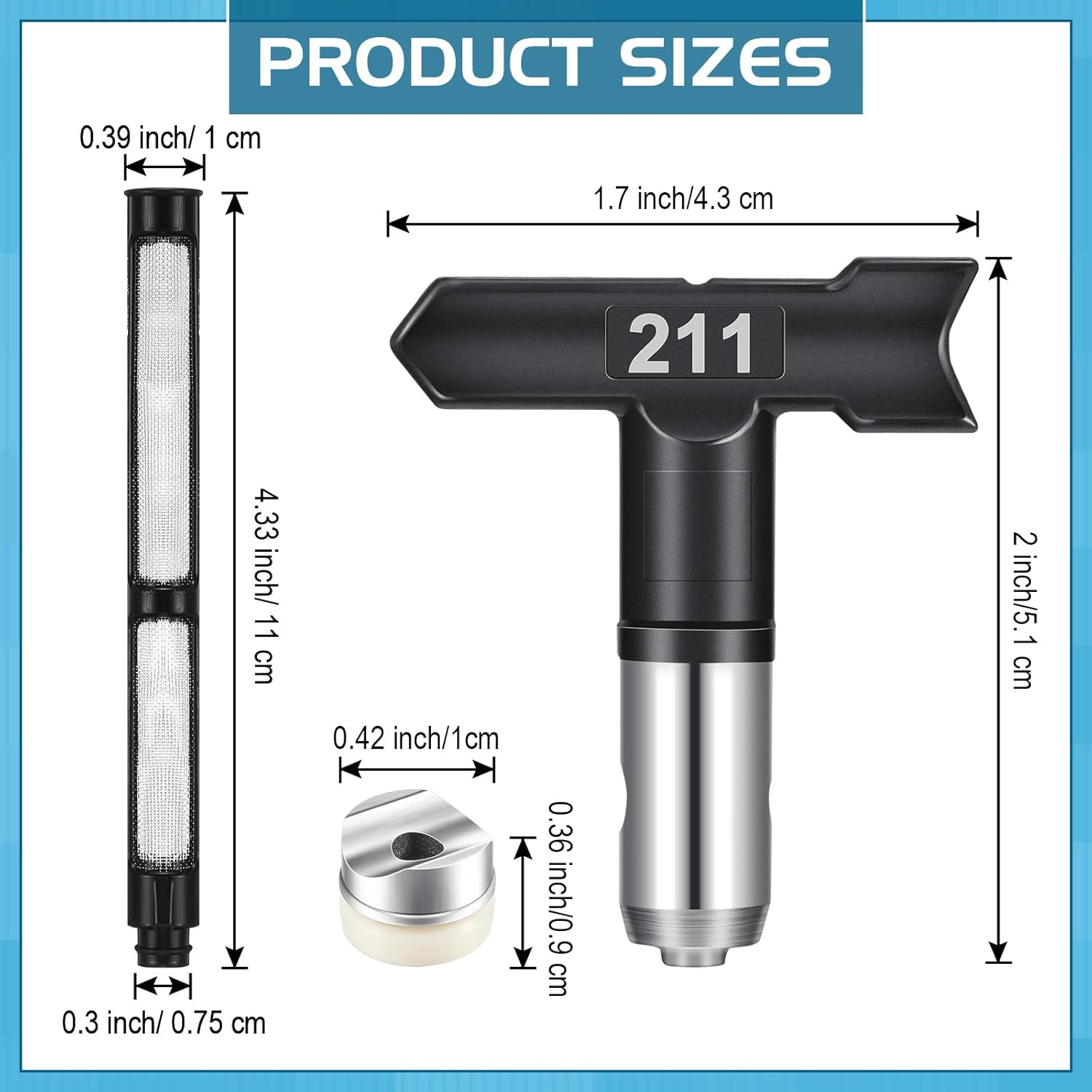 High Applicability: airless paint sprayer nozzle is compatible with most airless sprayers, and there are many types to choose; The length of spray gun filter is about 4.33 inches/ 11 cm, the diameter of large port is about 0.39 inches/ 1 cm, and the diameter of small port is about 0.3 inches/ 0.75 cm