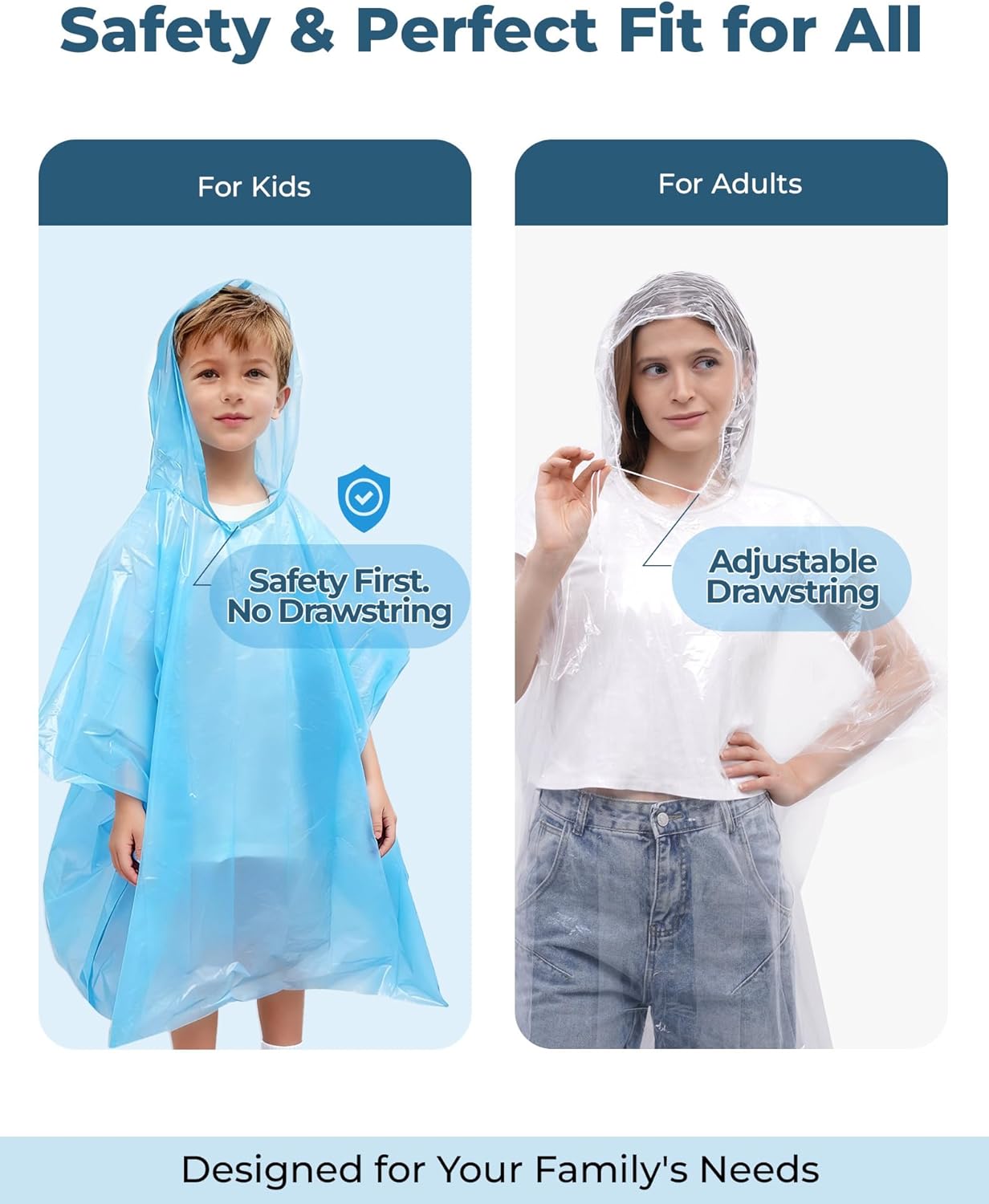2.SAFE, NO-DRAWSTRING HOOD FOR KIDS & ADJUSTABLE FOR ADULTS— The kids ponchos feature a safe, non-adjustable hood completely free of drawstrings, offering parents worry-free protection. Adult ponchos come with an adjustable drawstring hood for a secure, custom fit in windy conditions.