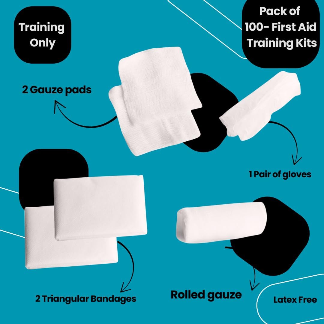 Each kit contains 2 Triangular bandages, 2 Gauze pads, 1 Pair Gloves, Rolled gauze (4.1 yds