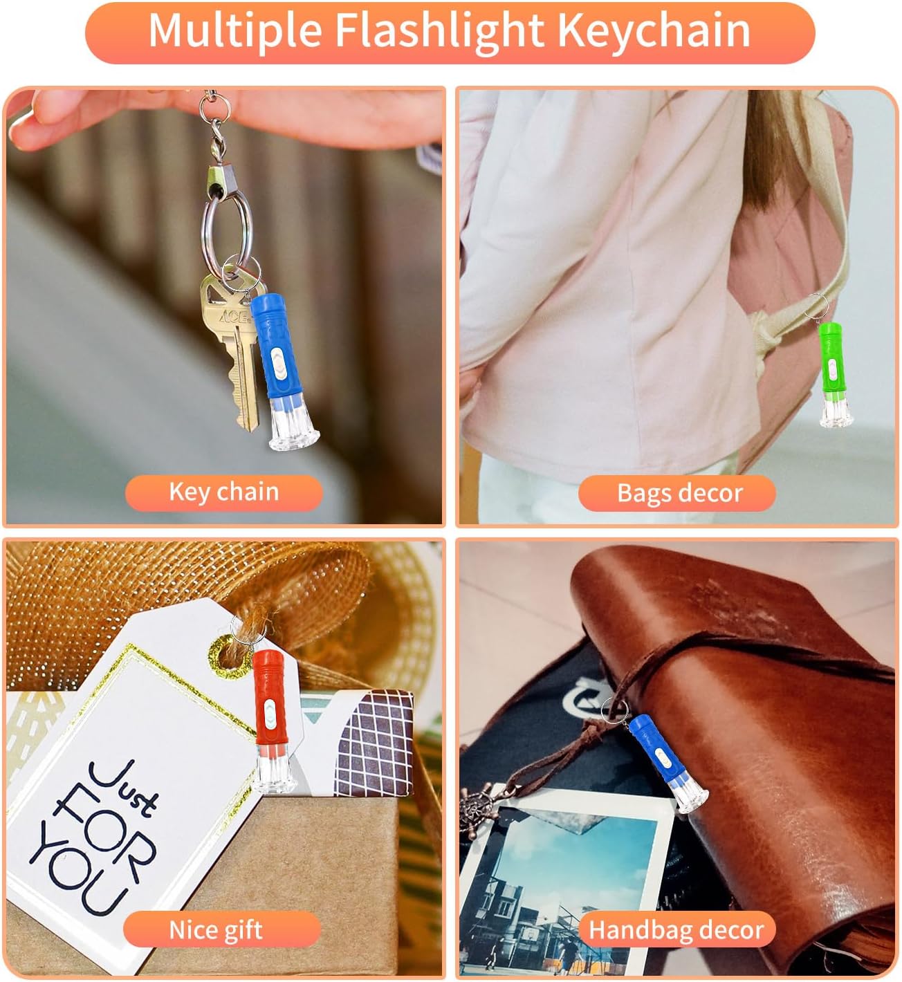 100 Pieces small flashlight : The package comes with 4 colors mini flashlights. Red lights, green lights , blue lights and yellow lights. Up to 100 pieces flashlight keychain for you to decor your different kinds of bags and pocket. Easily meet your various use and replacement demands. Choose the color of mini light according to your bag or clothes.