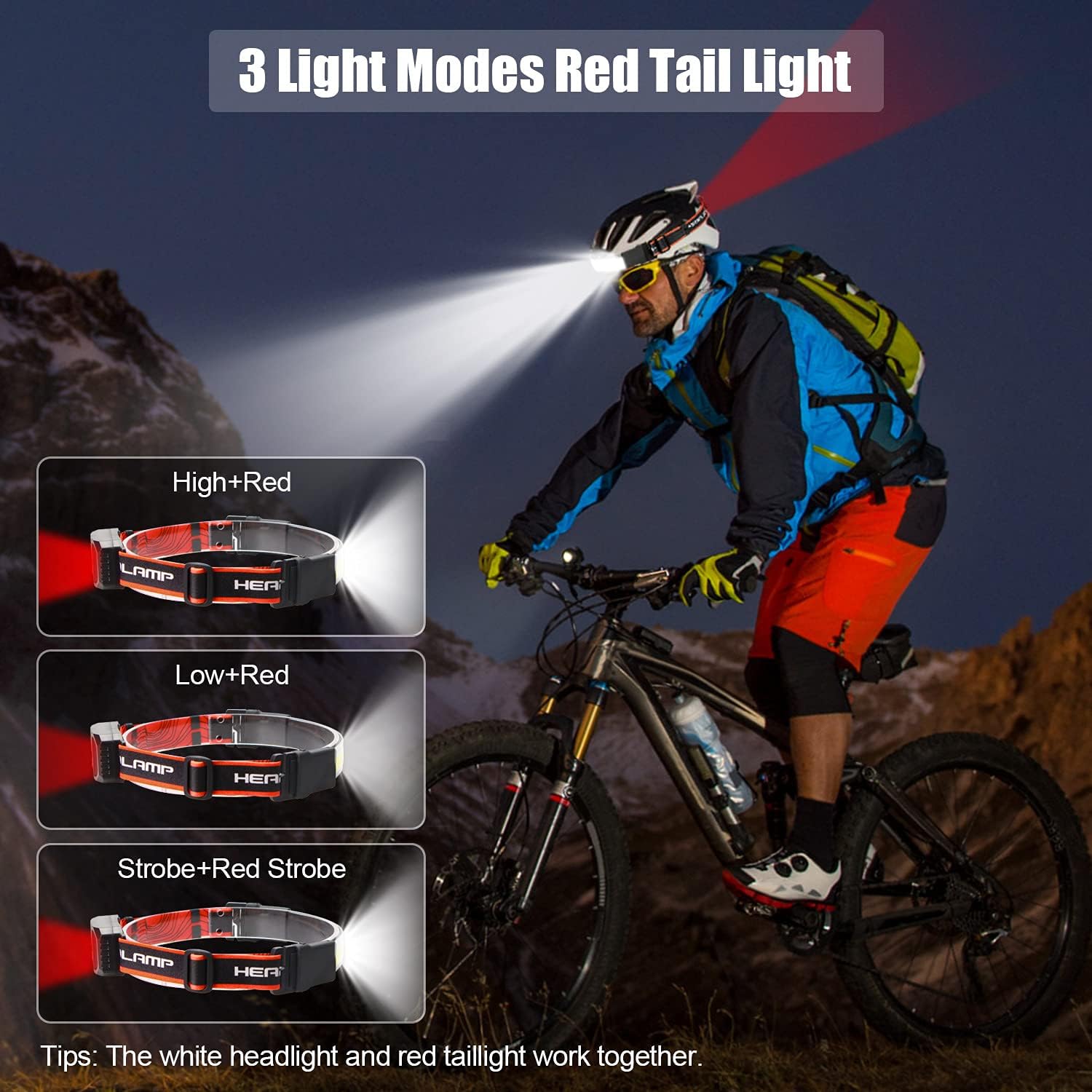3 Modes Easily Operation&Lightweight —3 light modes, High/Low/Strobe, the white headlight and red taillight will work at the same time. Very easy to use. The rechargeable headlamp is only 3.7ounce(weight with battery), it’s a lightweight camping tool that can be used comfortably all the day. More comfortable than traditional headlamps, they are bulky and heavy on your forehead, Ours feels more like you are wearing a baseball cap than a headlamp.