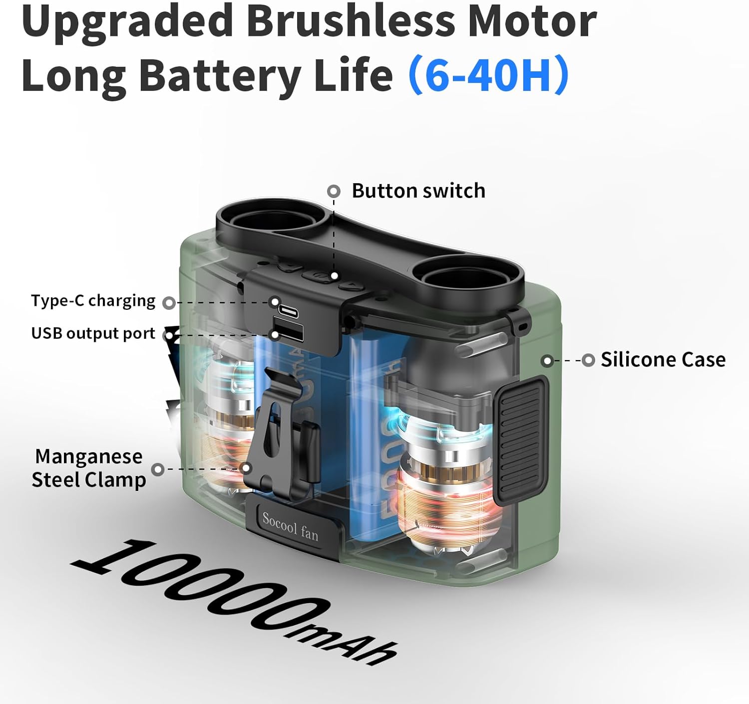 【10-Speed Powerful Airflow】Equipped with a high-speed brushless motor (up to 16000RPM), this USB fan delivers up to 19.8CFM of strong airflow for instant cooling. With 10 gears and adjustable wind speeds from natural to strong, it can be set to various modes according to your needs when you are using it. Enjoy up to 4 hours on max speed or 20 hours on low which is an ideal choice for outdoor workers