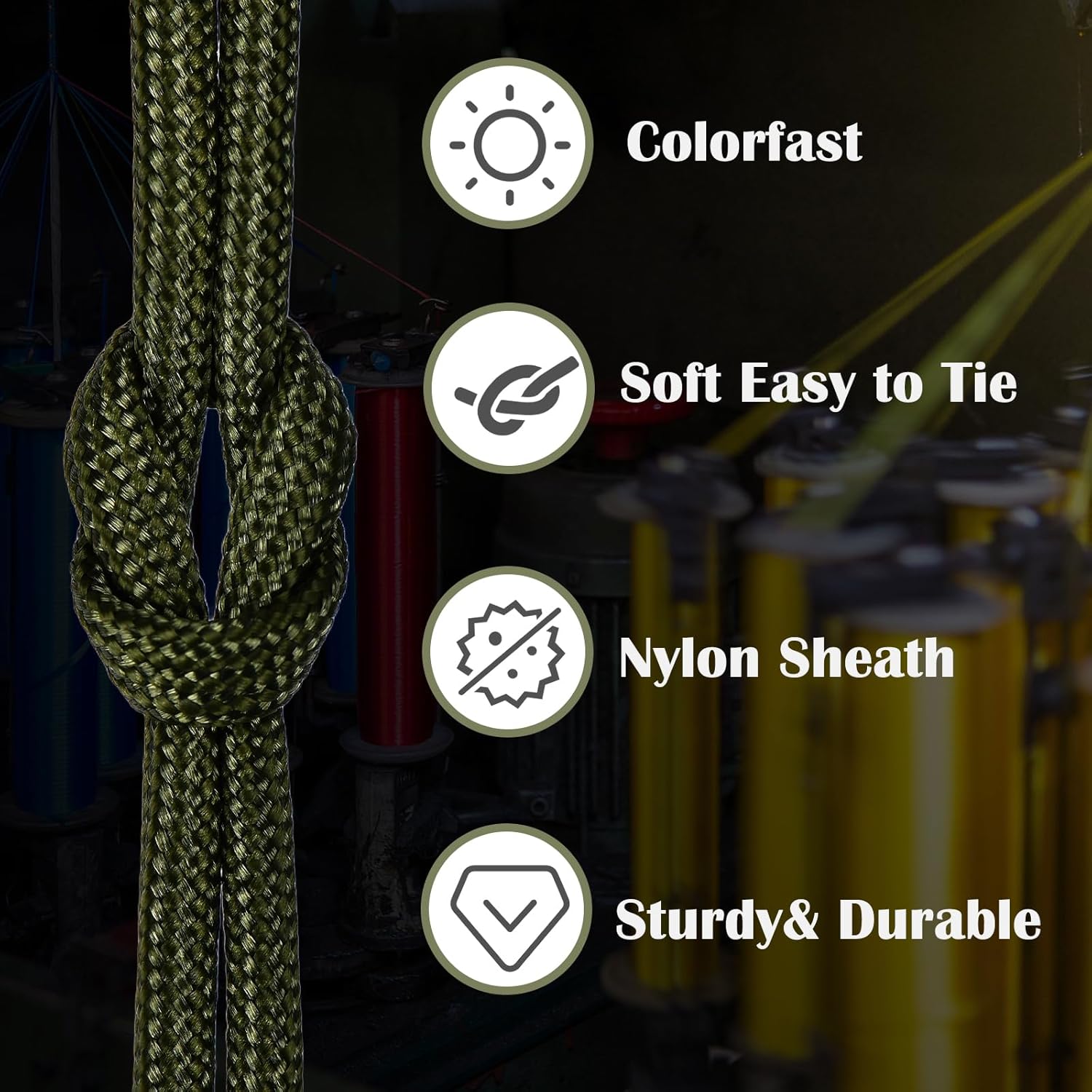 Weaved Parachute Rope: The paracord consists of 32 strands of 7 strand inner core with 3 yarns per strand. Maximum breaking strength is 550lbs. soft and easy to knot, suitable for all paracord making projects