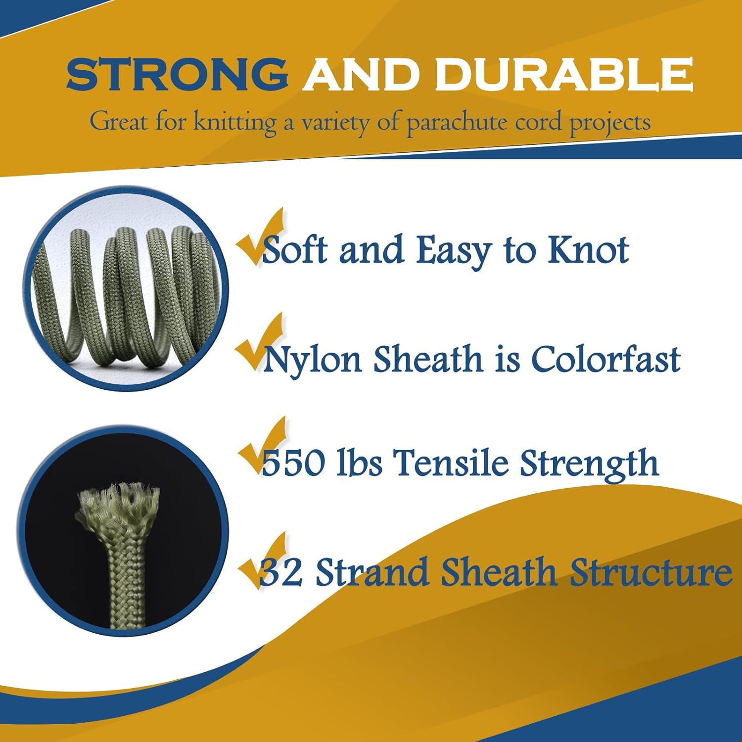 Weaved Parachute Rope: The paracord consists of 32 strands of 7 strand inner core with 3 yarns per strand. Maximum breaking strength is 550lbs. soft and easy to knot, suitable for all paracord making projects
