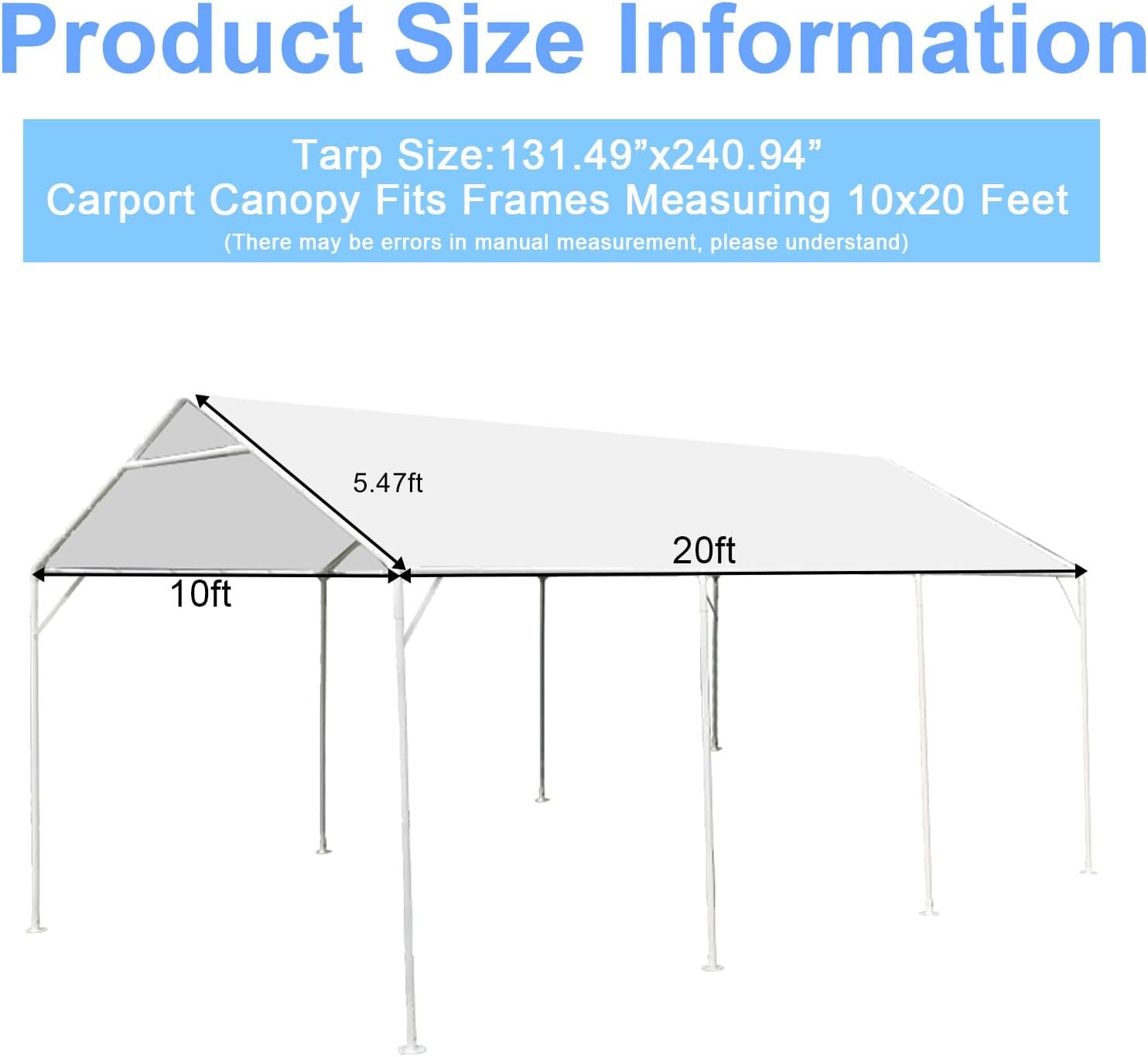 10 x 20 FT Canopy:The carport cover displays a considerable length of about 236.22 inches and a width measuring roughly 126.77 inches, fits for most frame in size 10 x 20 ft on market, perfect for outdoor settings, such as in the backyard, at a campground, or a construction site.Please check your carport’s size before purchase.