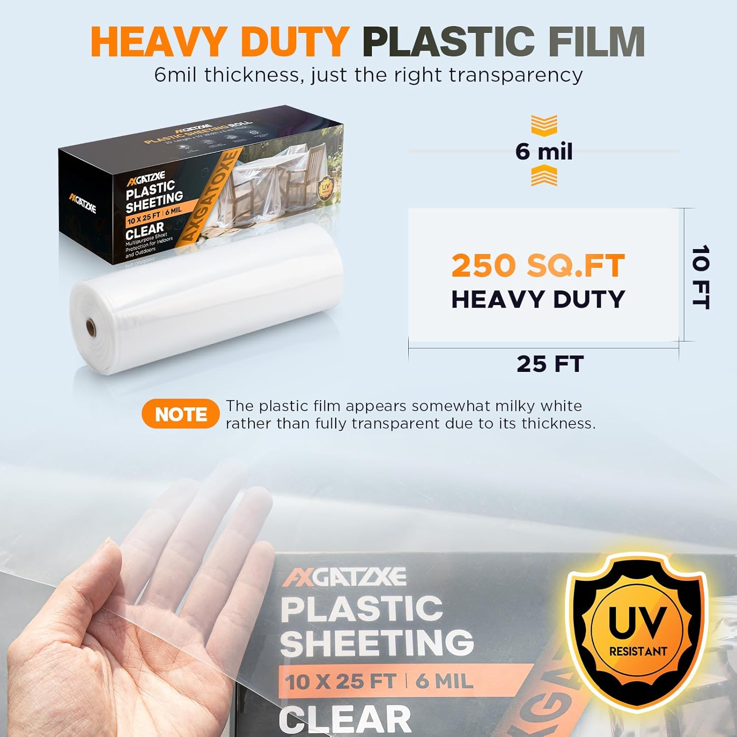 3. Massive 10×25 FT Coverage (250 SQ.FT): Each 10×25 ft sheet (250 sq.ft total coverage) effortlessly drapes over greenhouse frames, furniture stacks, or construction zones. The clear polyethylene film allows light transmission while protecting mattresses, warehouse goods, or outdoor equipment