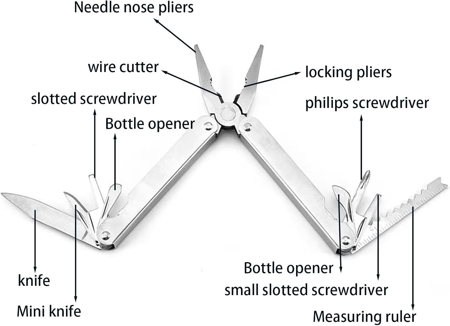 11-in-1 Multi Tool: Multitool knife, pliers, screwdriver, scissors, wire cutter, ruller, bottle opener.