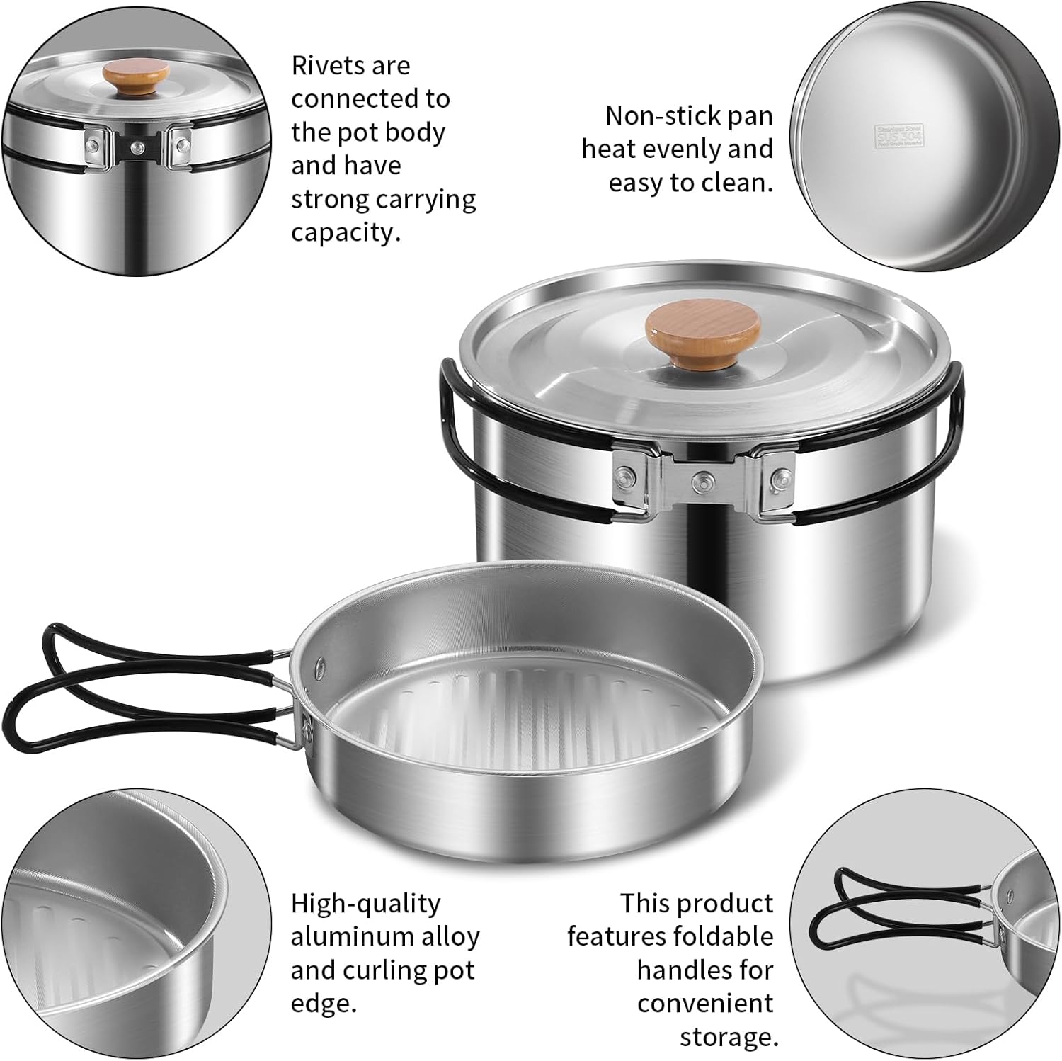 【Wide Stove Compatibility & Anti-Scald Design】The cookware works seamlessly with camping stoves, gas stoves, and even small charcoal grills—no need to worry about mismatched gear. The foldable handles are wrapped with heat-insulating silicone strips (or designed with extended heat-dissipating structure), preventing accidental burns when moving hot cookware. The lid is equipped with an anti-scald knob for easy opening, adding an extra layer of safety during outdoor cooking.
