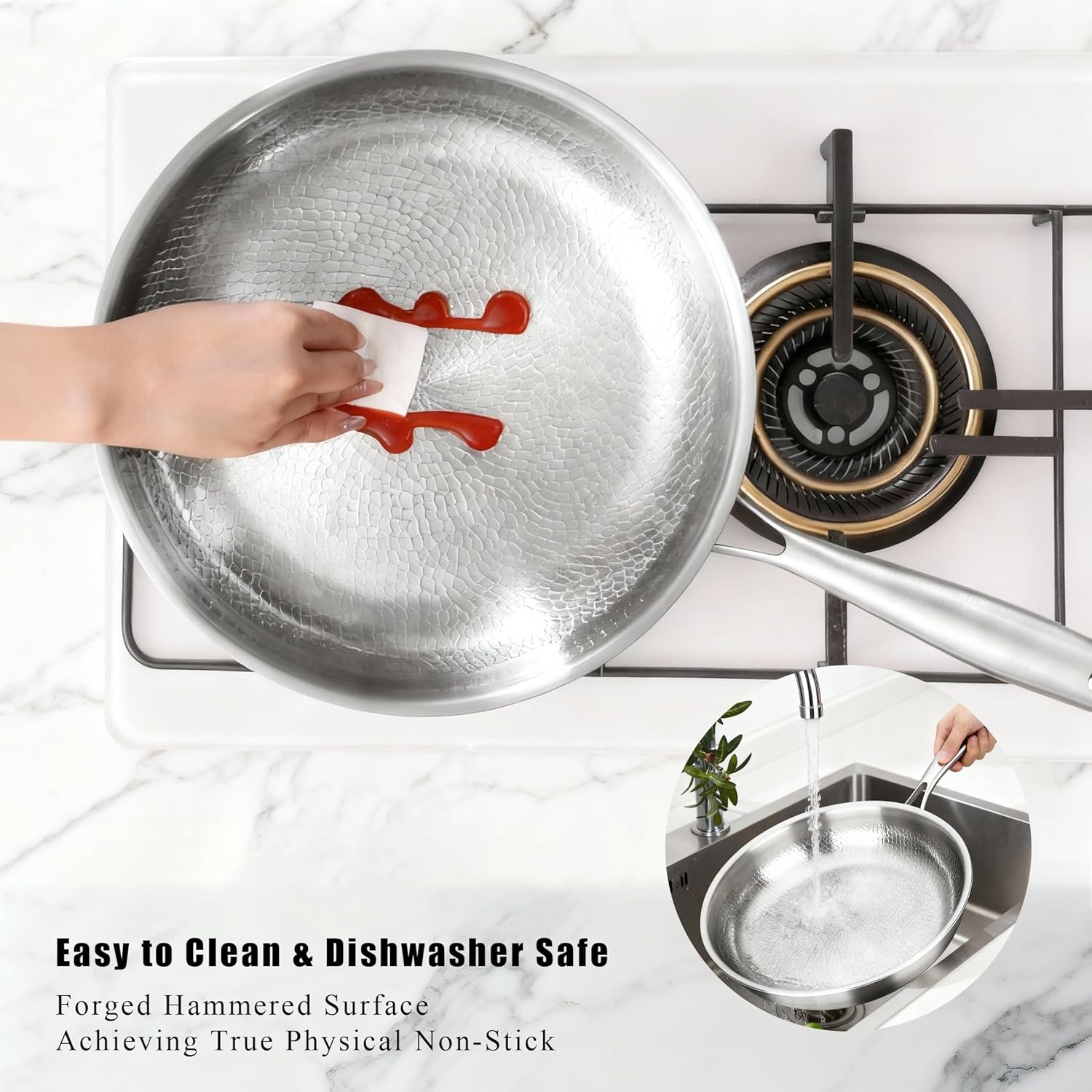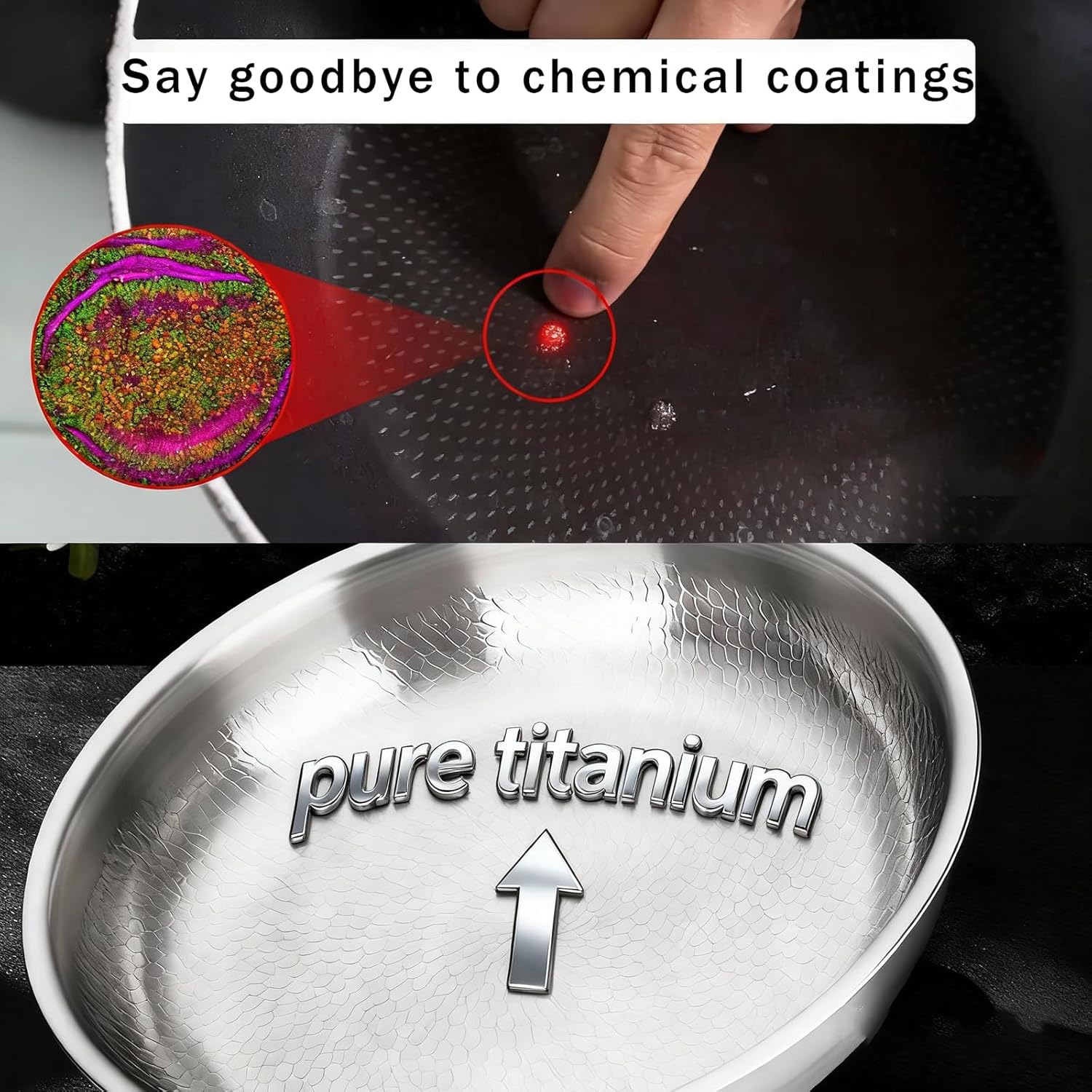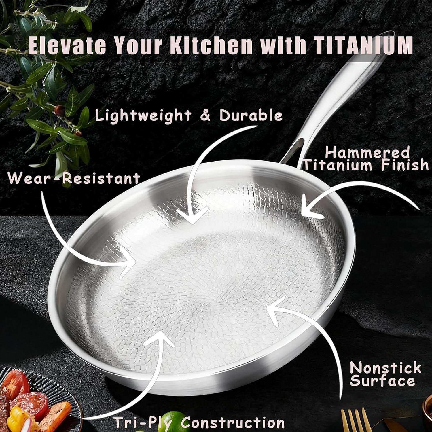Premium Hammered Titanium Surface Crafted with a stunning hand-hammered titanium finish that’s lightweight yet ultra-durable, offering natural nonstick performance without any chemical coating or toxins
