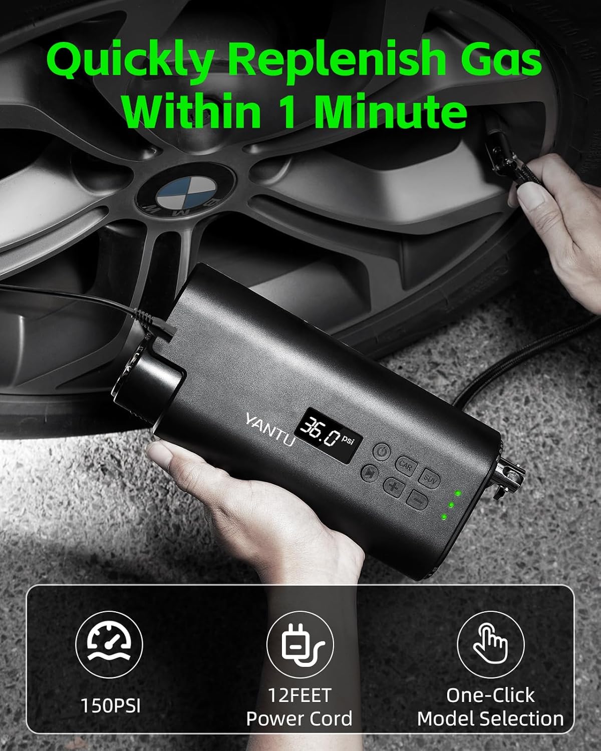 【Portable Air Compressor】 Say goodbye to long waits! Our tire inflator boasts a dual-cylinder design for rapid air delivery, filling tires in just 1 minute, maxing out at 150PSI. Perfect for roadside emergencies, it features One-Click Model Selection for seamless operation with cars and SUVs alike. Stay mobile with the ultimate in portable air compressor convenience.