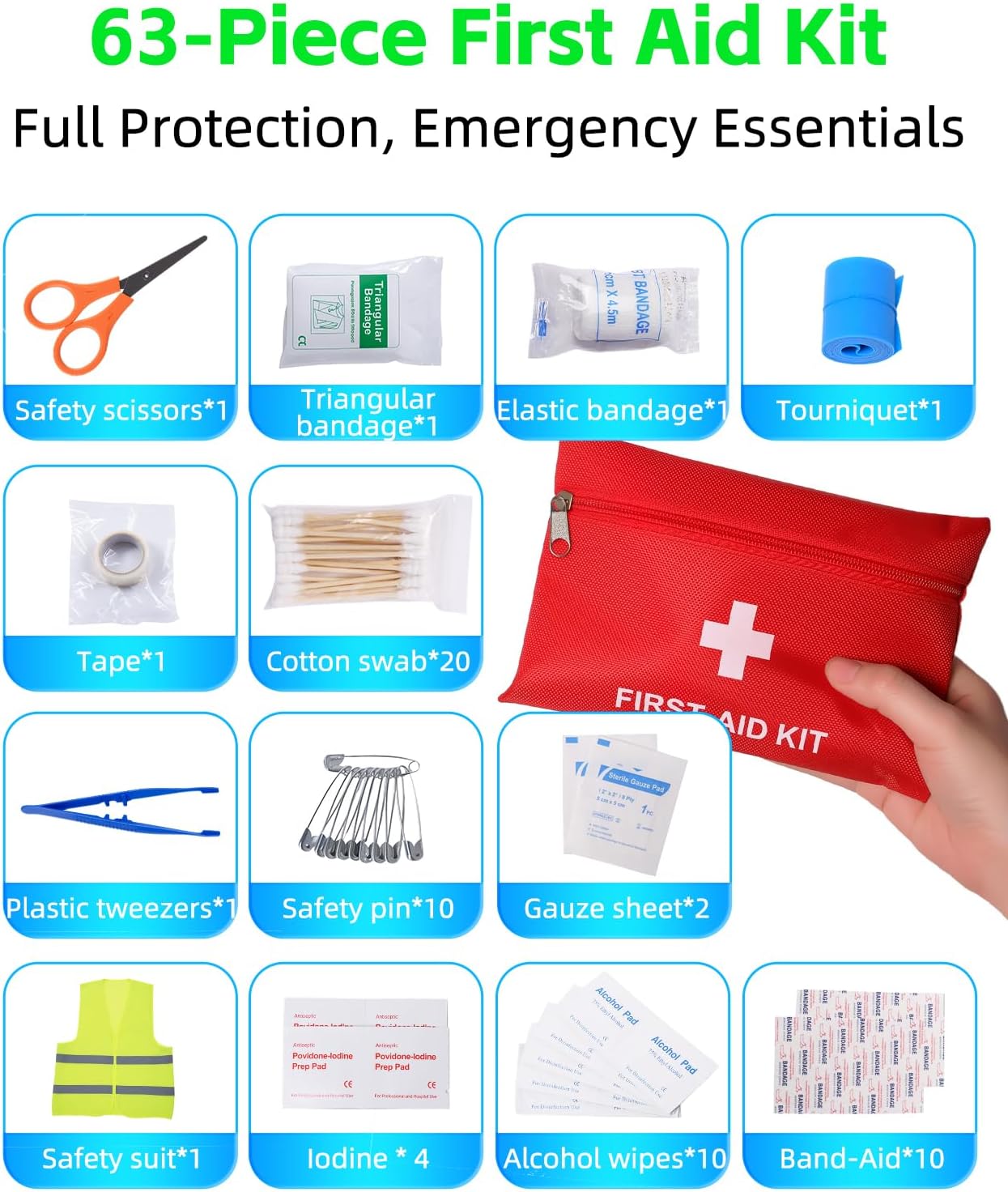 【Extensive 63-Piece First Aid Kit for On-the-Spot Care】 – Stay Prepared: Includes bandages, band-aids, scissors, tweezers, antiseptic wipes, and much more. Neatly organized to treat minor injuries and emergencies on the spot. An essential addition to your car emergency kit.
