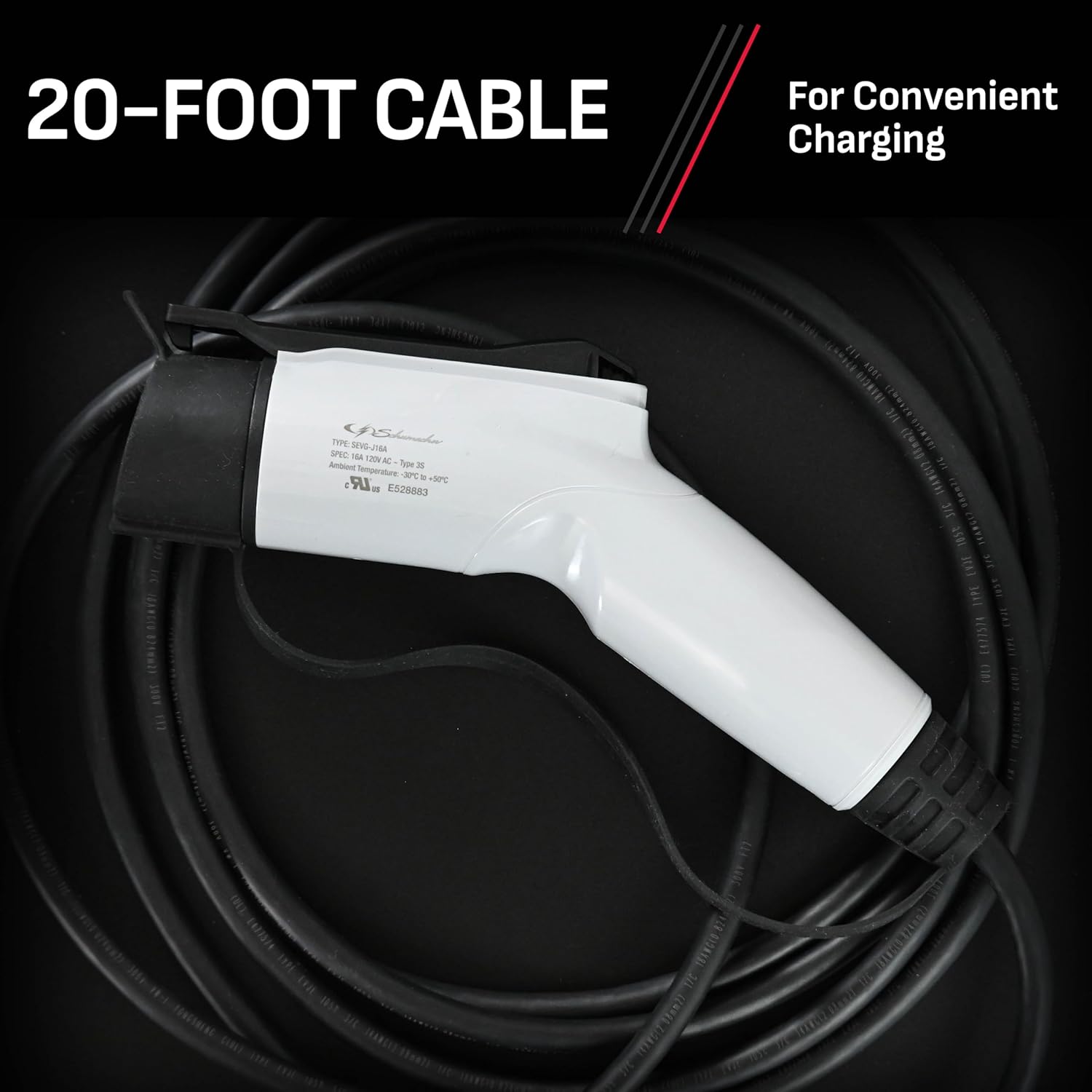 20-Foot Charging Cable – Allowing easy reach to both bays of a two-car garage or a vehicle parked in a driveway, ensuring hassle-free electric vehicle charging in any setup
