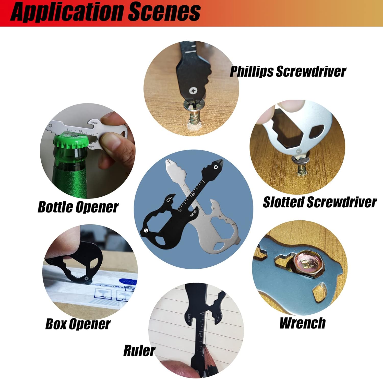 [ 12 in 1 Pocket Multi tool ]: These small guitar-shaped multifunctional tools contain 12 functions, Including Bottle Opener, Slotted Screwdriver, Phillips Screwdriver, Bike Spoke Key, Imperial, and Metric Ruler, Open Wrench, Lanyard Hole, etc.