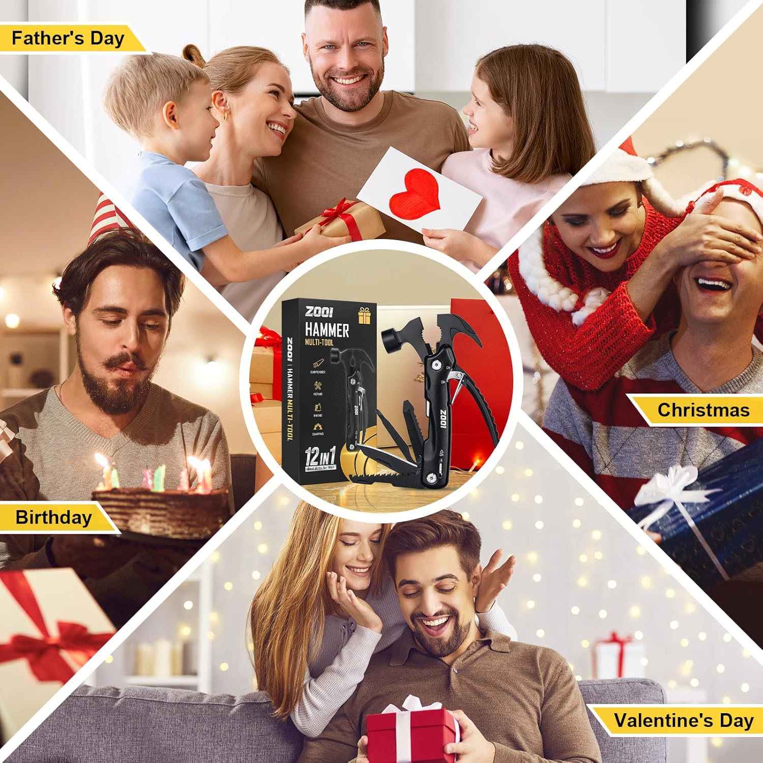 【Valentines Gifts for Him】ZOOI tool hammer with 12 functions, including a mini hammer, pliers, serrated knife, saw, wire cutter, prying claw, nail file, bottle opener, flat and phillips head screwdrivers. The pliers have 2 safety locks on the handles with a locking function, which is one of the most useful tools in daily life