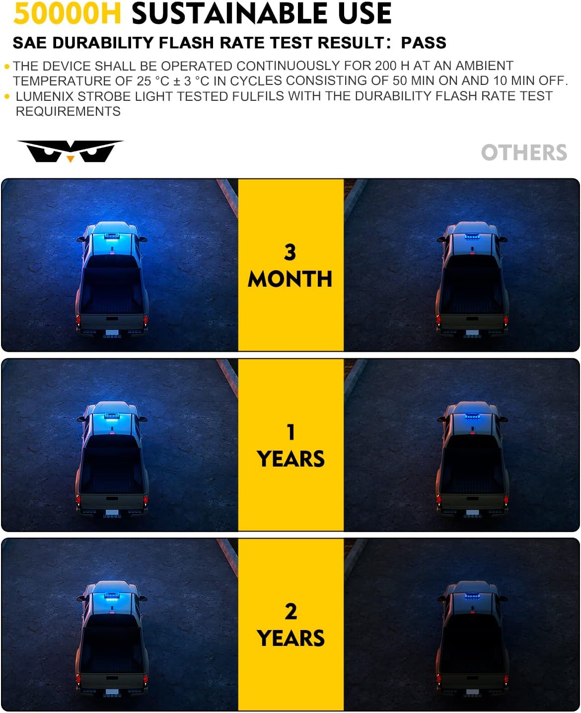 EXCLUSIVE PATENTED DESIGN – Lumenix enhanced roof top strobe beacon light with a multi-textured look, upgraded for a more robust and durable design. Long lasting ABS housing with scratch resistant high transmittance PC lens. Enclosed design to withstand harsh rain, snow and other weather.