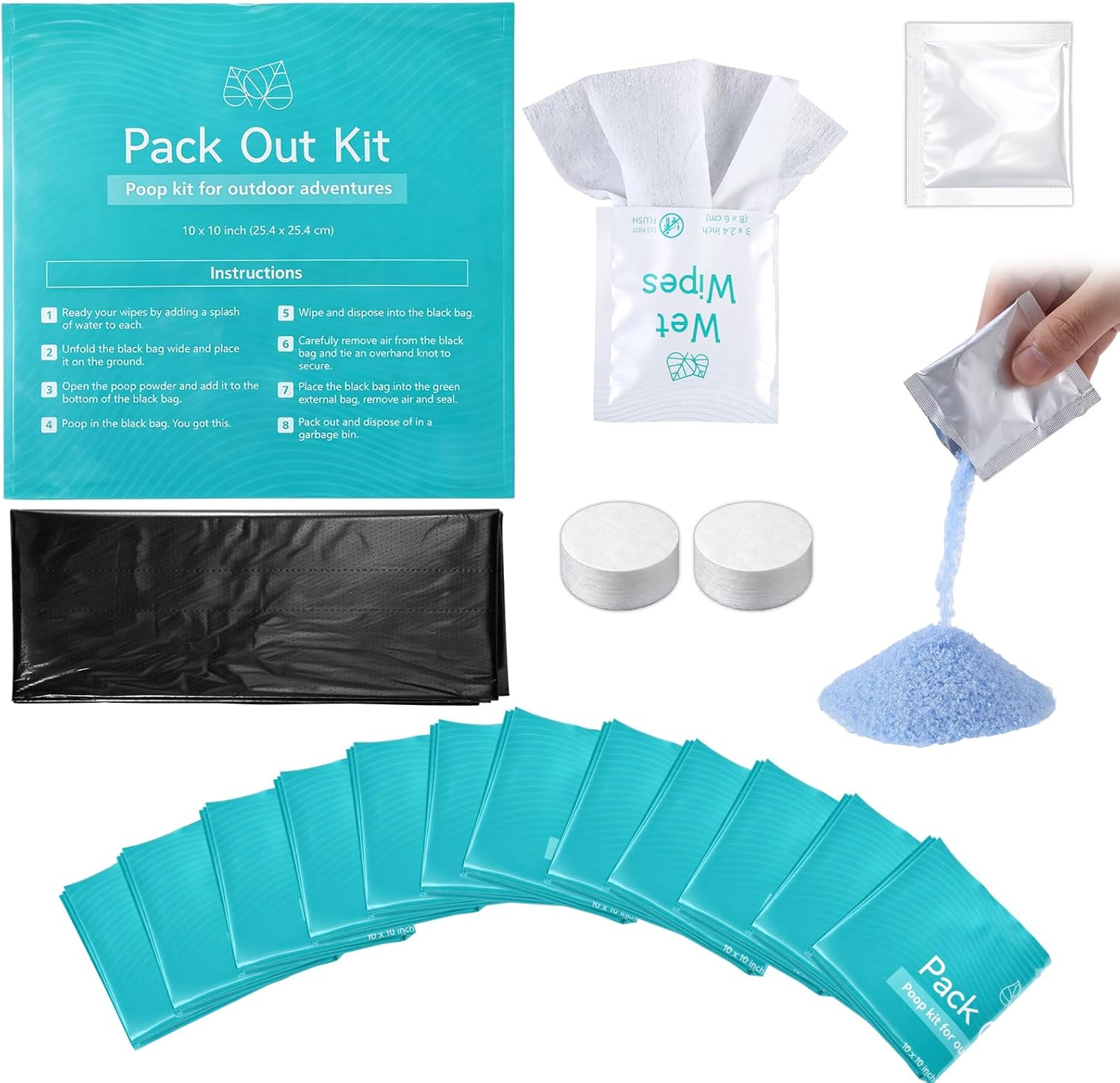 All-in-one Sanitation Solution: each camping poop kit contains a waste bag, a pack of wet wipe, a disposal bag, a pack of deodorizing powder, and 2 compressed towels; It’s convenient for those without a toilet and allows for safe removal of waste