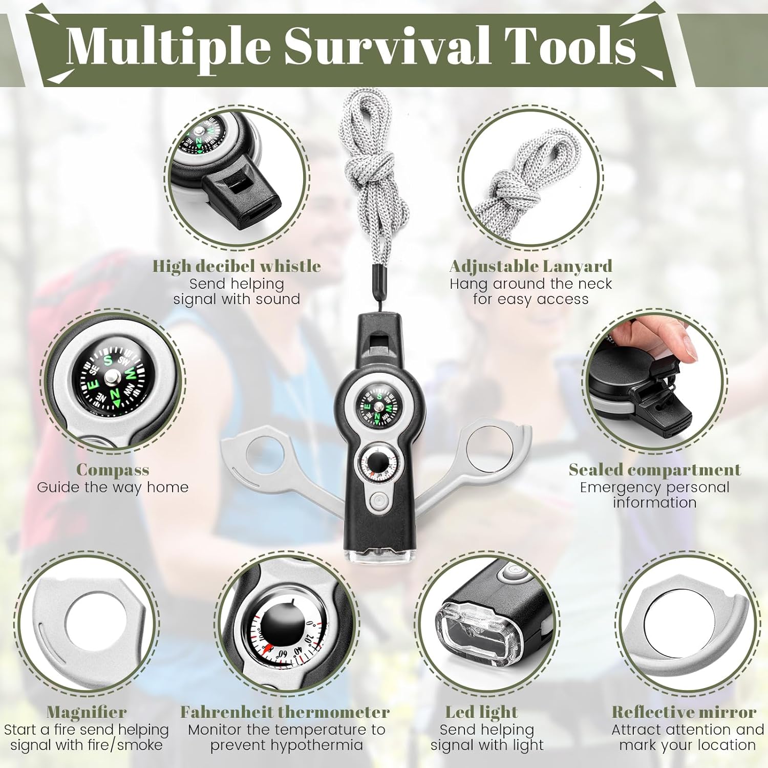 Multifunctional Design: this camping whistle is thoughtfully designed with 7 integrated features, a whistle, a compass, a thermometer, a magnifying glass, a reflector, a storage bin and LED light; All these components can be quickly disassembled and assembled, suitable for providing essential information during outdoor activities; With all these features intertwined, every adventure becomes safer and more enjoyable