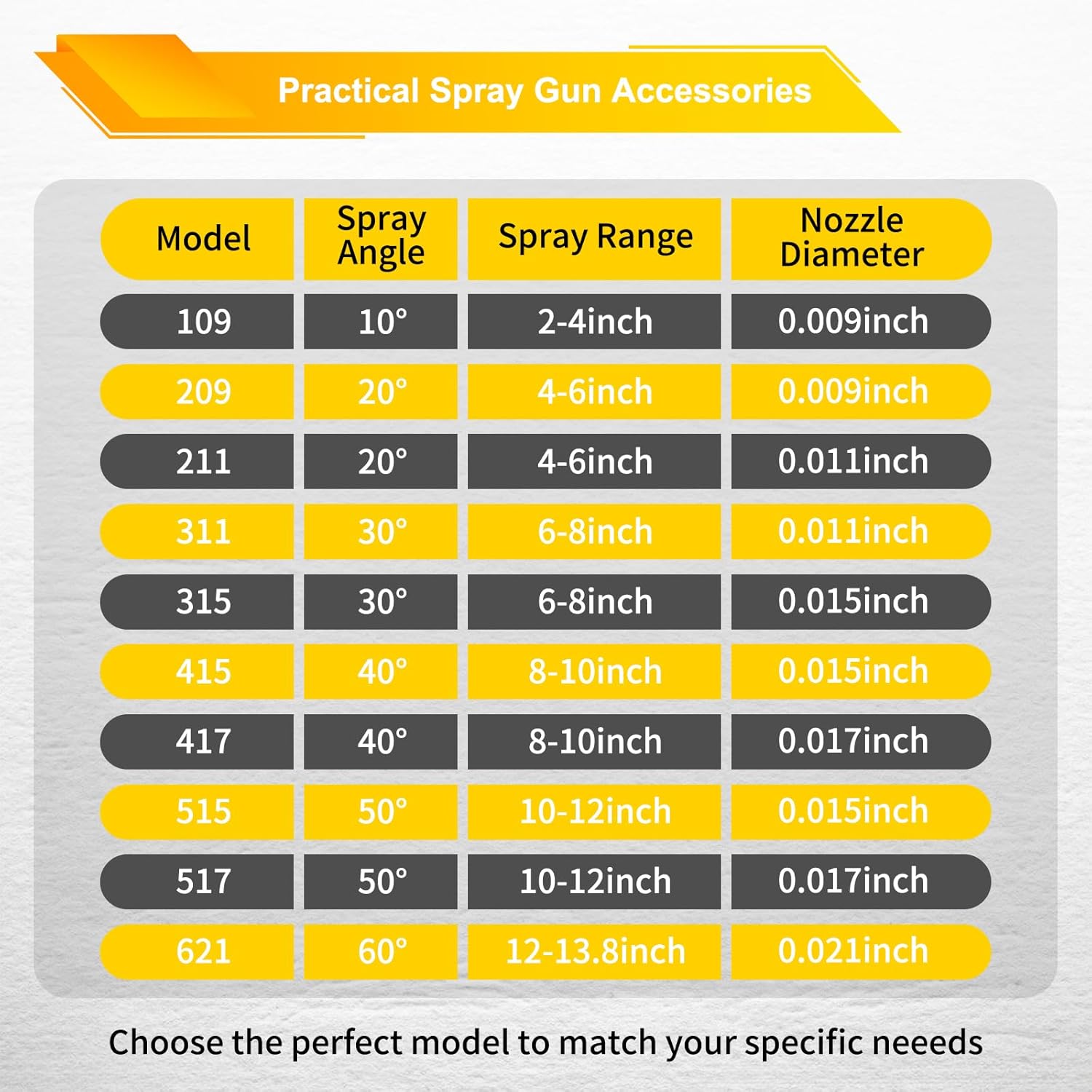 Package Contents: 10 Pcs different models of reversible airless spray nozzle tips (109, 209, 211, 311, 315, 415, 417, 515, 517, 621) + 2 nozzle bases (fits 7/8″ thread spray guns only)