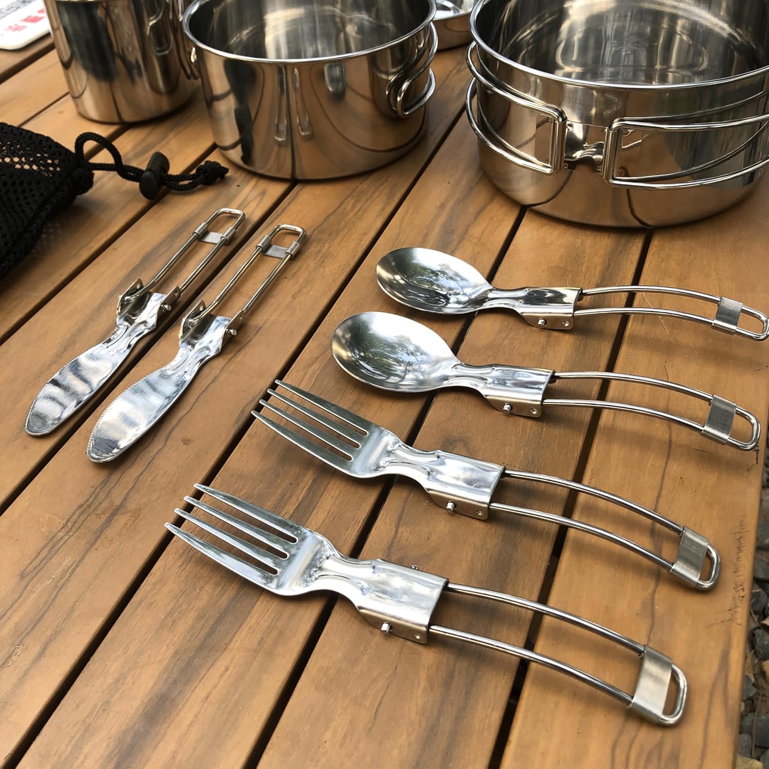 Versatile Cookware Set: The set includes a 2 small pots/bowls, a small frying pan,2 cups, 2 forks,2 spoons,2 knives, and 1 small dish and storage bag for convenient organization.