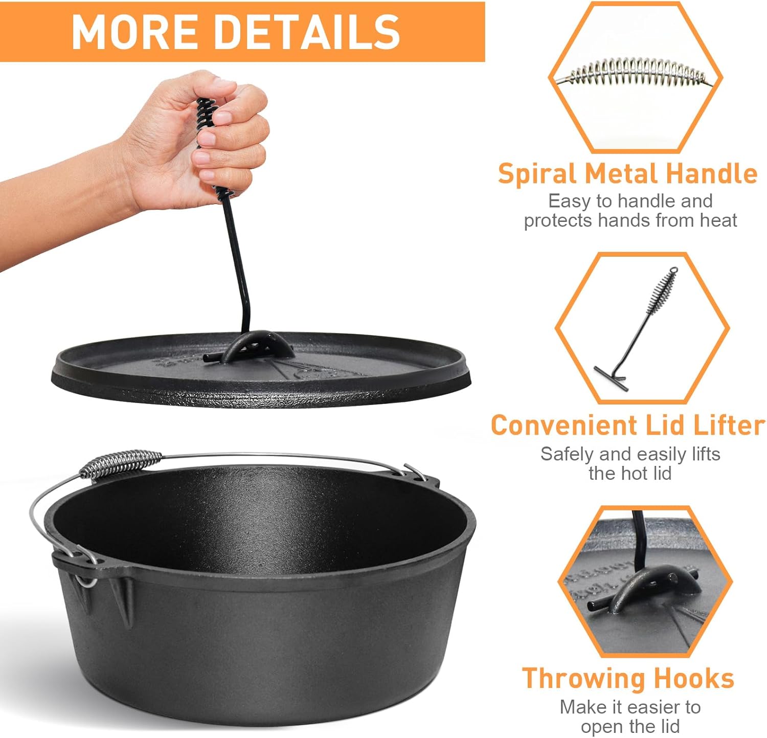 Excellent for Camping: Considering the weight of cast iron, each Dutch Oven Pot with Lid comes complete with a lid lifter for safe removal from heat, which can make sure your safety and convenience. Featuring a spiral-shaped handle, this Cast Iron Dutch Oven with Lid is ingeniously designed to prevent heat from being conducted to the handle