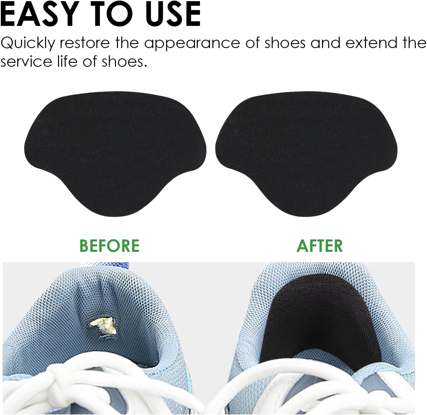Complete Repair Kit Configuration: Package includes 6 pairs of generously sized patches with pre-applied adhesive backing, eliminating the need for additional bonding materials. The comprehensive kit provides multiple repair options for extending the life of various footwear styles