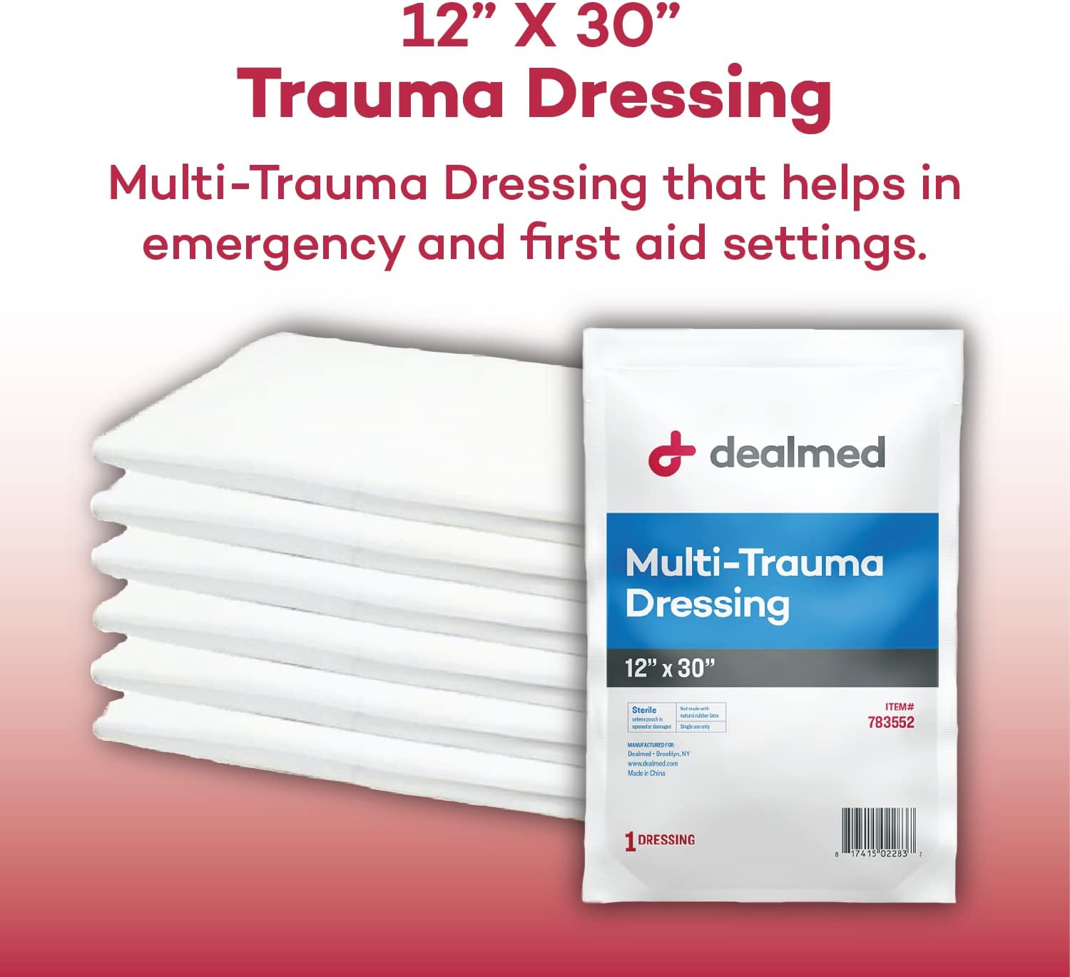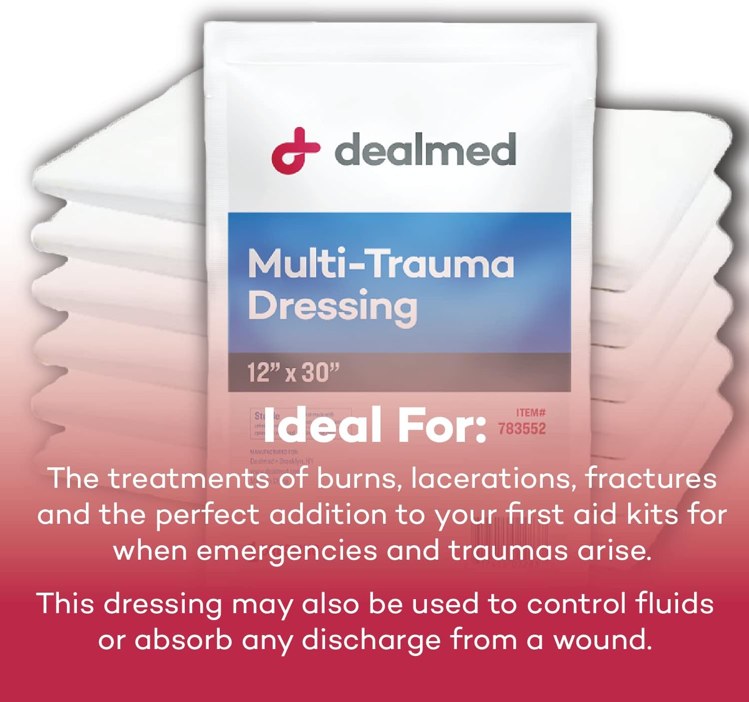 Multi-Trauma Wound Dressing: The Dealmed Multi-Trauma Dressing is a sterile, non-woven, absorbent pad, that helps in emergency and first aid settings. It is ideal for the treatments of burns, lacerations, fractures and the perfect addition to your first aid kits for when emergencies and traumas arise.