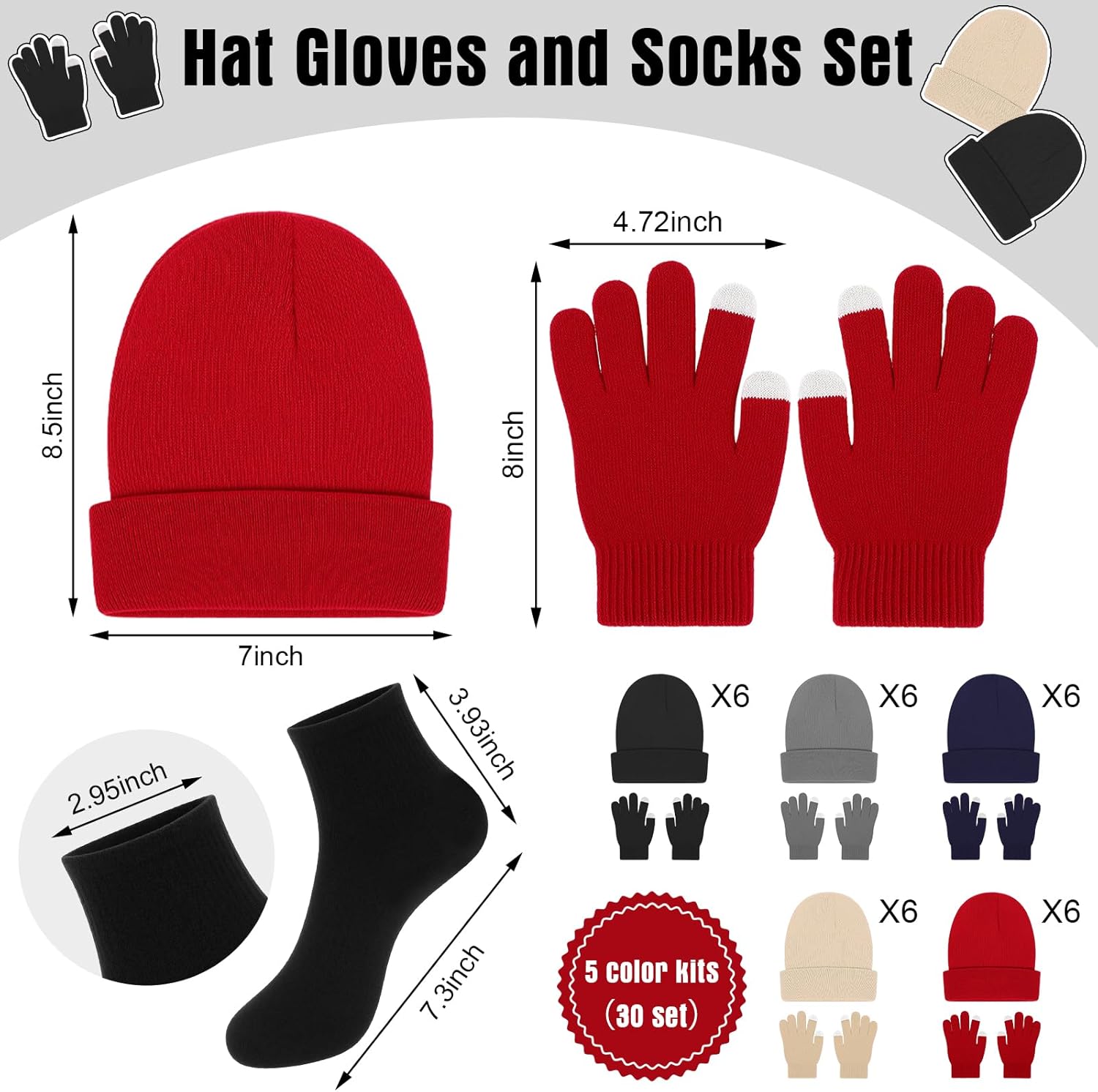 Hats, Gloves Socks Set: made from soft, durable materials to keep hands, feet, and head warm and dry in cold weather; It fits for men and women; Touchscreen gloves allow device use in winter, combining comfort, practicality, and full cold-weather protection