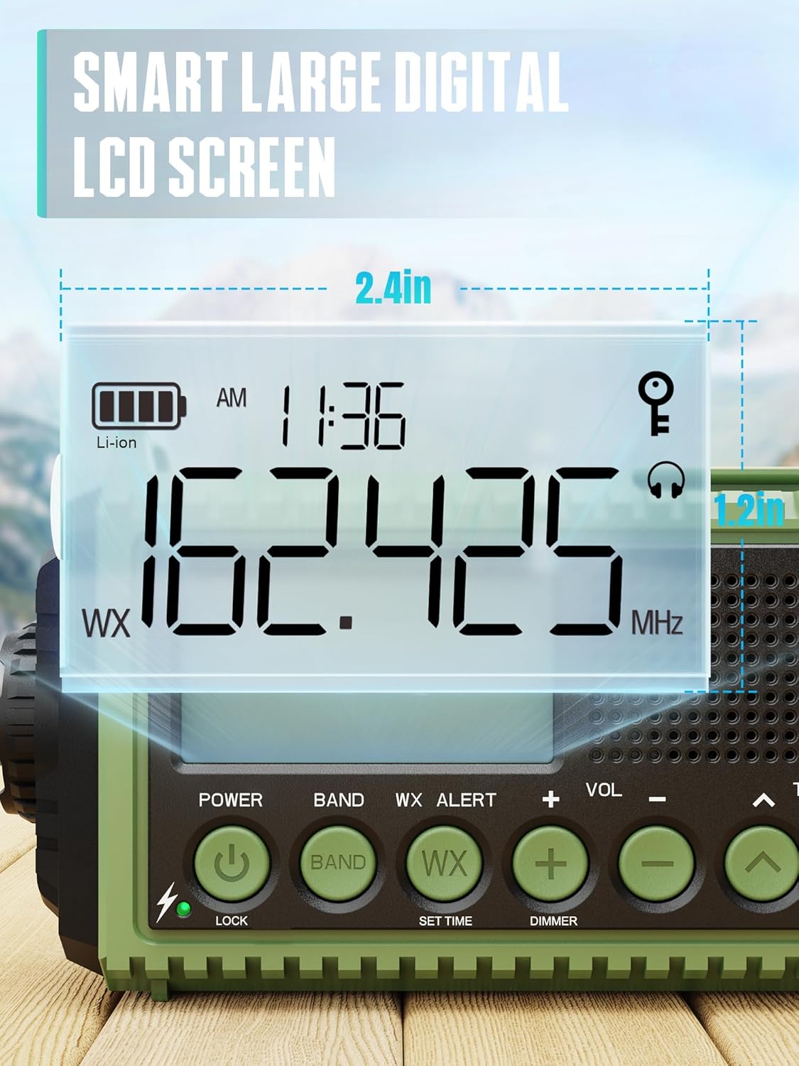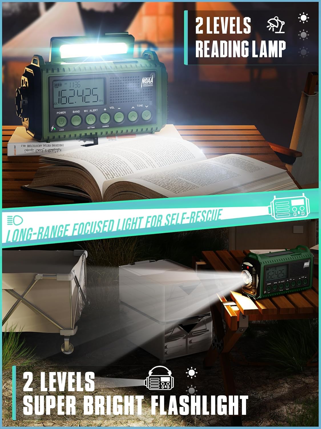 【Longest-Lasting Survival Radio】 – This weather radio has a built-in 12000mAh rechargeable battery, providing several days of continuous use on a single charge. Perfect for extended outdoor activities or power outages, it ensures reliable NOAA/AM/FM emergency weather updates. The emergency radio features a super-bright flashlight and a reading lamp, a loud 116dB SOS alarm, a hand-crank, and a solar panel for battery charging.