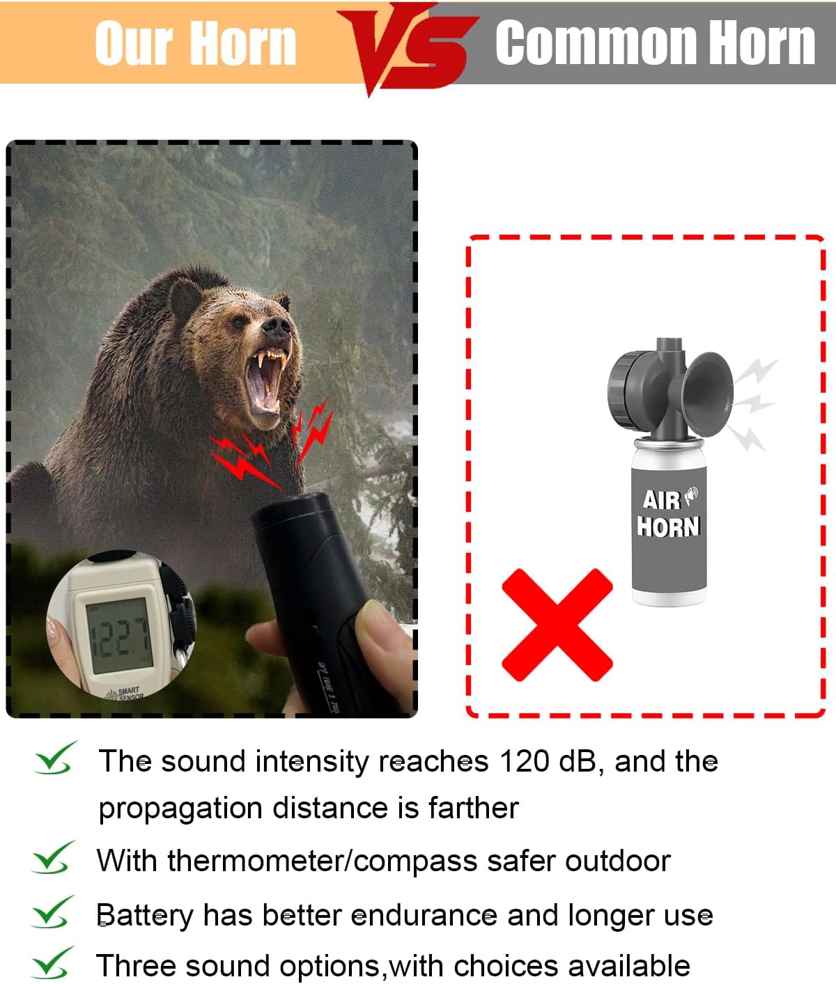 Easy To Use: The streamlined appearance and compact size makes the grip of the electronic bear horn,One-button switch can create 120±5dB volume ideal for scaring bears and other wildlife