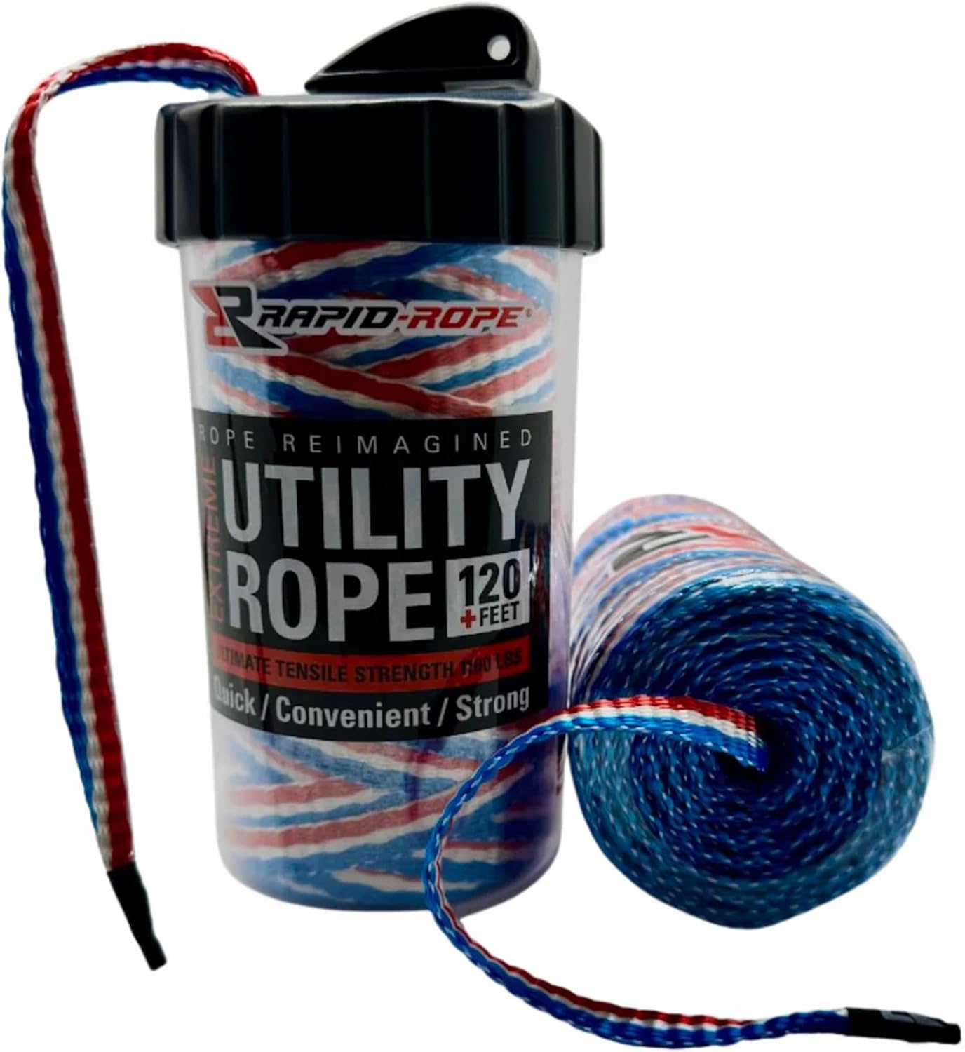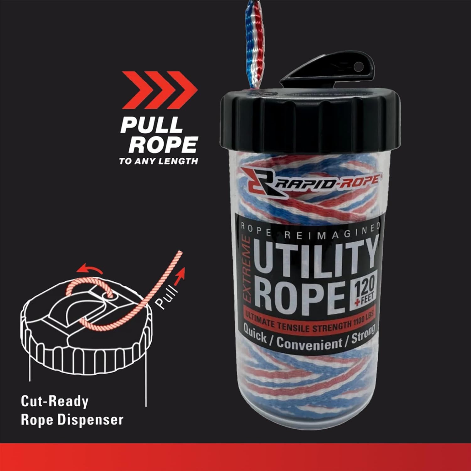 FLAT TACTICAL PARACORD: 1100 pounds of tensile strength can hold just about anything! The rope itself is flat and braided. It fits into a convenient canister that is about the same width, and slightly taller than a 12oz soda can. This product has a patented built in cutter attached to the top of the canister. This keeps your fingers safe, and provides an easy way to cut the cord. Rapid Rope can easily fit in a cup holder, survival bag, hiking gear, fishing equipment and general use.