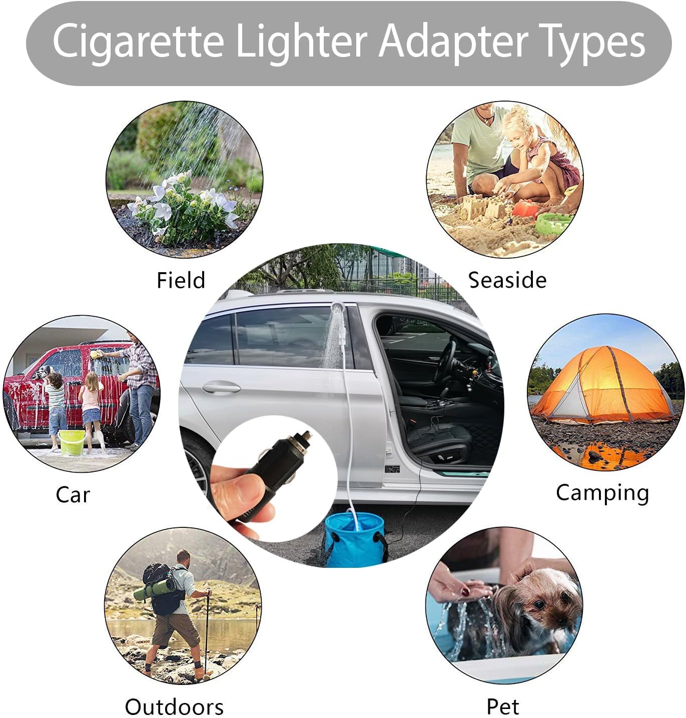 【Complete Kit, Multiple Choices】Base Kit Includes: Pump (with controller), 6 ft hose, showerhead, multi-angle hook, storage bag.Car Lighter Version: 12V plug for vehicles/RVs.You can also connect your own PD fast charging power bank by USB-C.