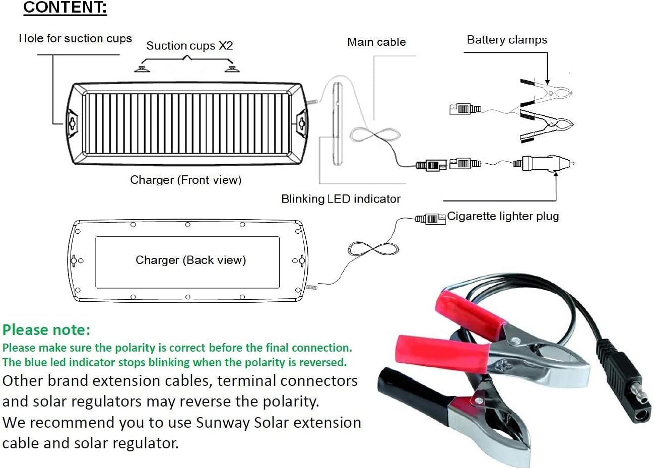 [Reverse Charging Protection]–With BUILT-IN DIODE for prevents reverse charging from batteries.With a 12volt LED charge indicator. The Led light up when it is charging. The solar charger maintainer Includes cigarette lighter adapter and alligator battery terminal clamps. We offer 12-Month warranty and good customer service.