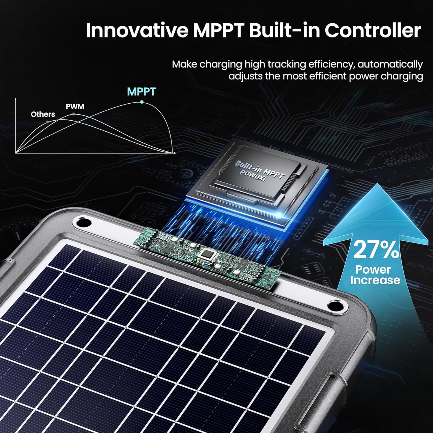 Innovative MPPT Built-in Controller: Maximizes charging efficiency with up to 99% conversion. The 12W MPPT charger adjusts power based on sunlight intensity, ensuring superior performance even on cloudy days compared to non-MPPT chargers