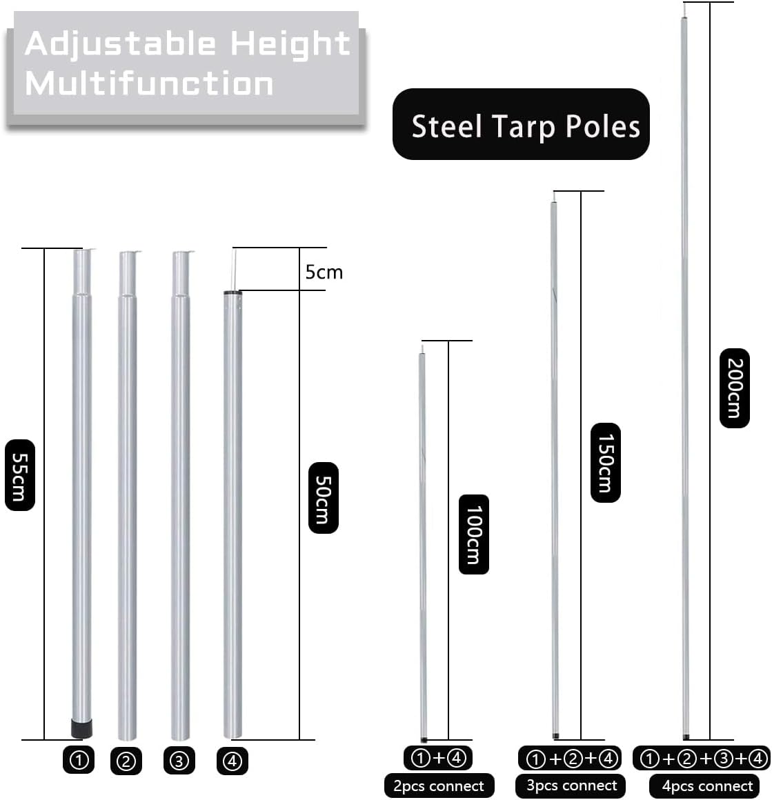 【LIGHTWEIGHT TARP】: The camping shelter is huge giving you all the coverage you need with the dimensions 410X410cm weight 4 .4lbs, making it easy to take with you, put in your backpack,etc.This tarp come with 200cm aluminum tarp poles.
