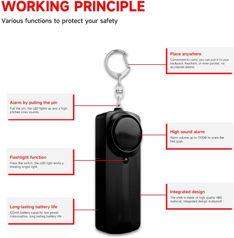 【130dB Personal Alarm & Strobe LED Light 】 Personal safety alarm for women features a loud 130db sound and LED strobe light. Disturbing attackers and drawing attention to themselves even at distances as far as 500 ft, the sound alert will last for 30 minutes until the pin is inserted.