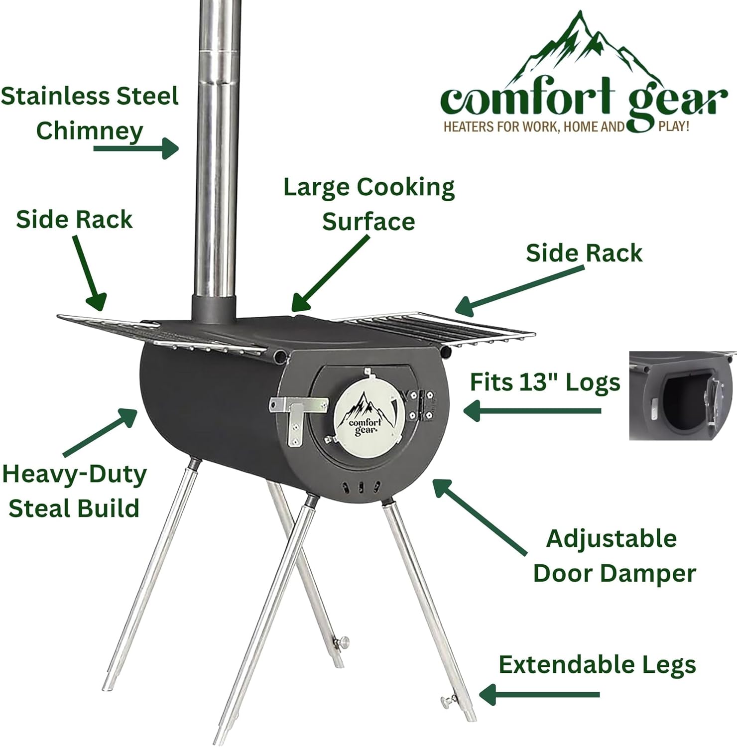 VERSATILE: Firebox measures 5.8″ H x 7.75″ W x 13.5″ L and can accommodate wood up to 13″ long and 3″ in diameter. Door opening is 5.75″ x 4.5″