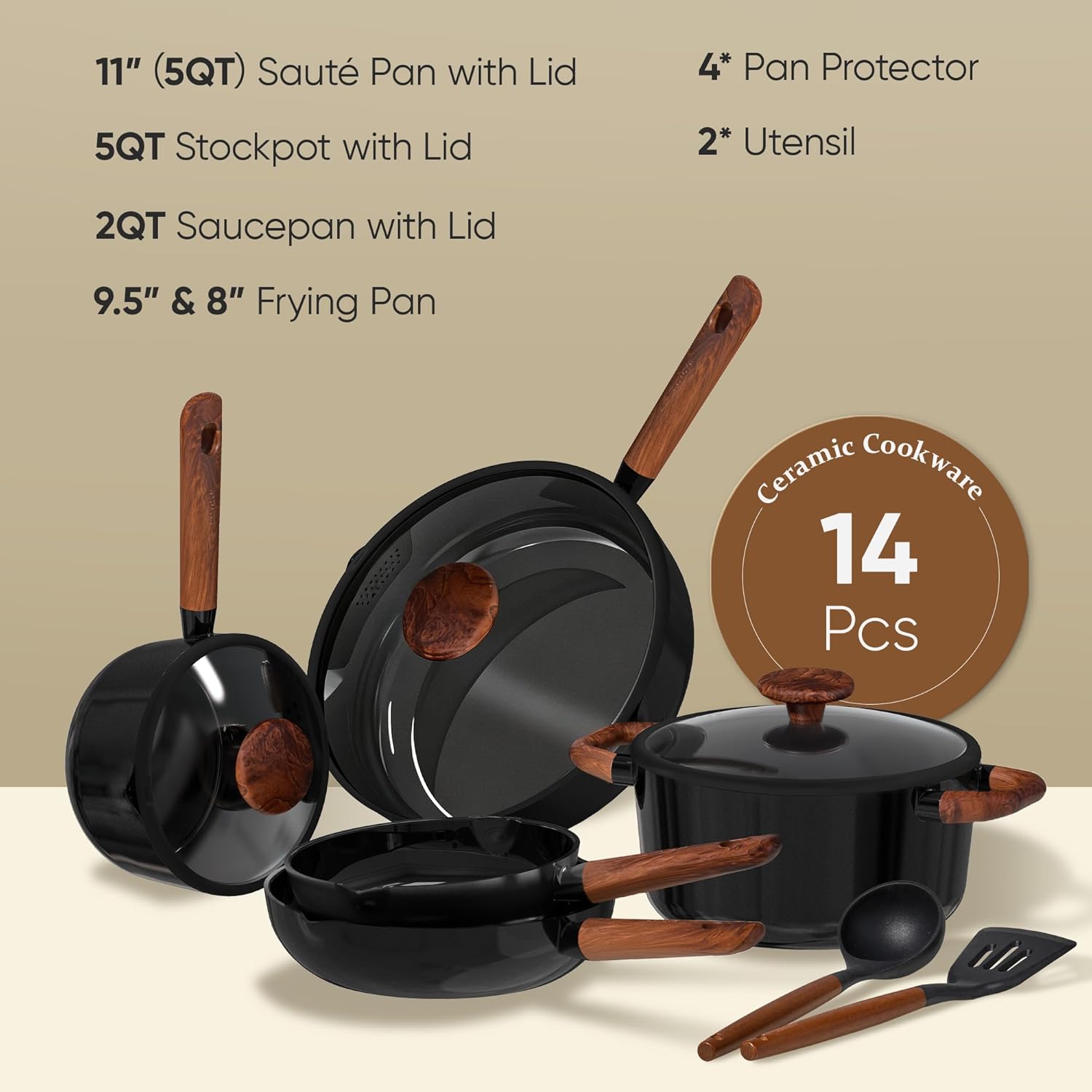 Set Includes: 8” fry pan, 9.5” fry pan, 2-qt saucepan with lid, 5-qt stockpot with lid, 5-qt sauté pan with lid, 2*utensil, 4*pan protectors.