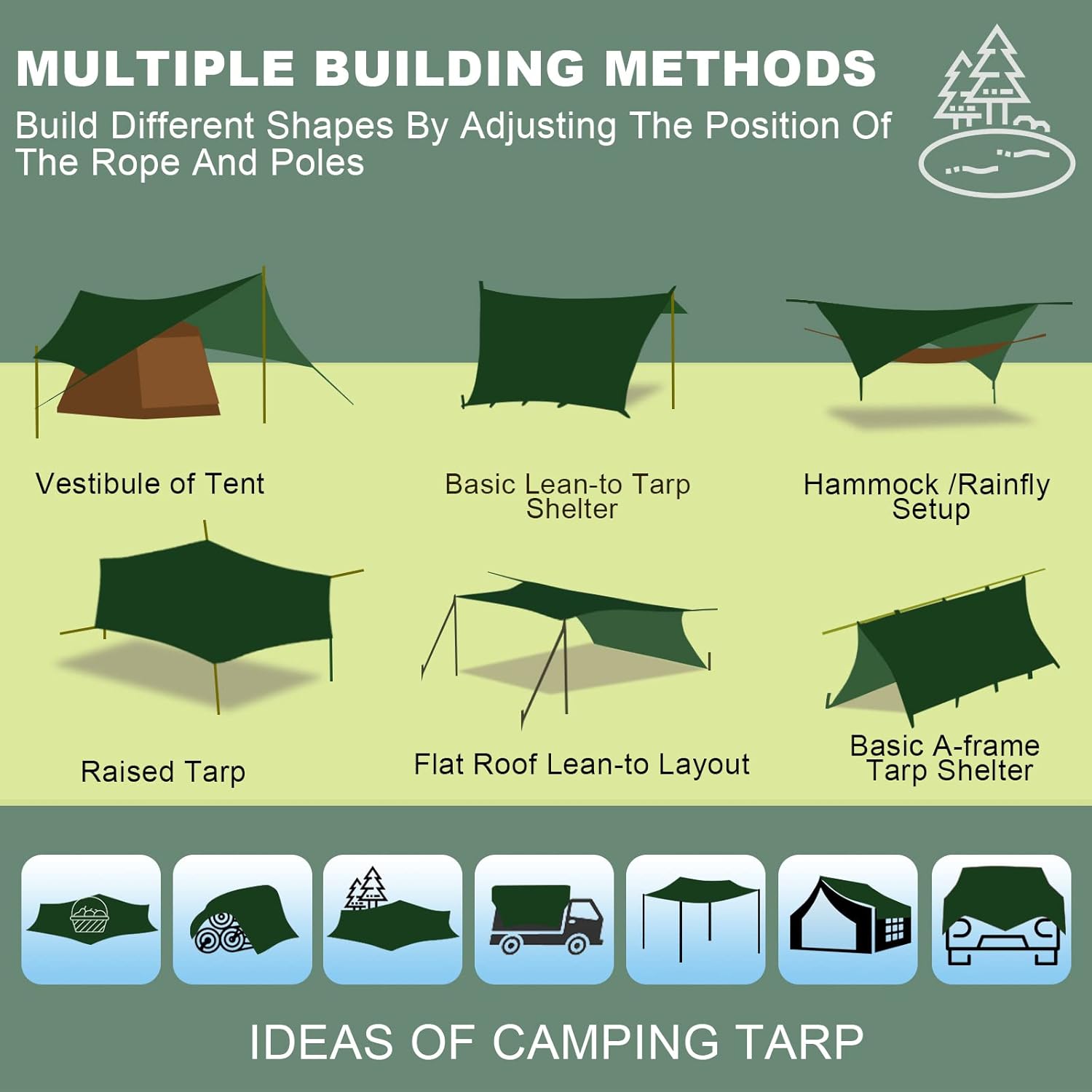 MULTIPLE SCENES & SHAPES: The camping tarp is suitable for a wide range of applications. You can use it in combination with a hammock to create a private space, camp anywhere with your vehicle, use it as a picnic blanket for outdoor dining, block UV rays on the beach, or even set it up as a shelter in your backyard. Its versatile design makes it perfect for professional outdoor enthusiasts